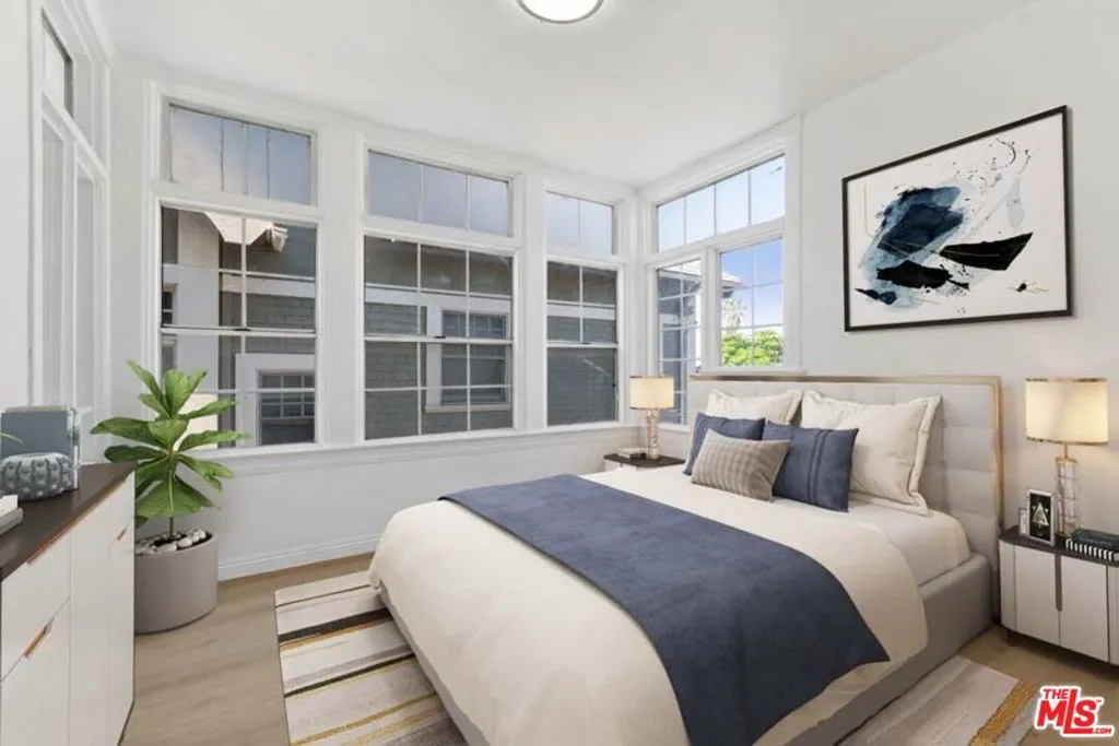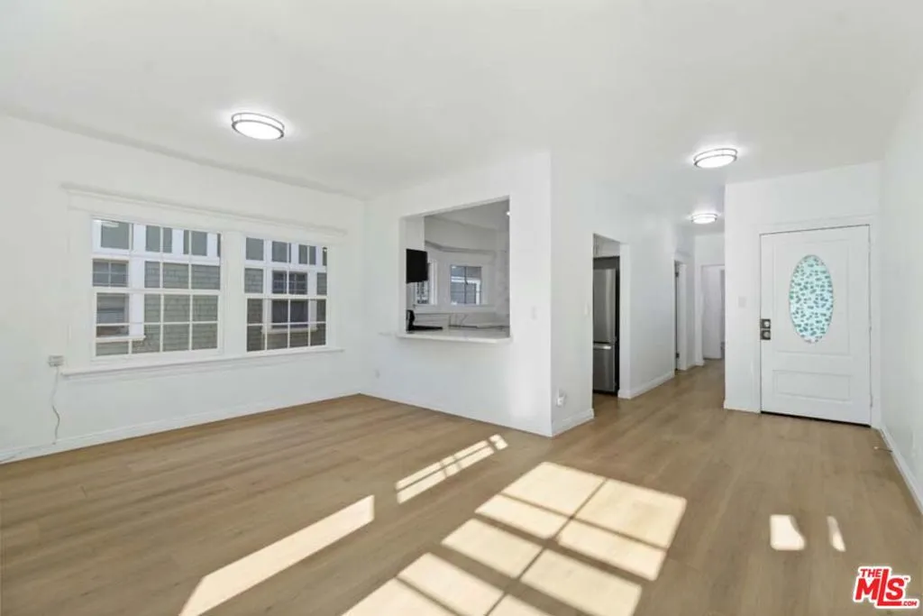 Completely Remodeled 2BD/1BA Bright Upper Unit with 2 Parking Spaces & Security! Ideally situated between 11th St and 12th St in a quiet, low-traffic neighborhood (15 mph residential zone). This second-floor unit features an abundance of natural light with an east-facing orientation and pleasant views. The unit has been fully renovated with brand-new upgrades throughout, including brand new modern kitchen appliances with new cabinets including pantry, granite countertop, refrigerator, microwave, and gas stove, waterproof flooring throughout, new dual-pane windows, and fresh interior paint. The property sits on a large 8,570 sq ft lot and offers excellent amenities: 2 parking spaces included, gated entry with automatic gate, CCTV security system, and additional guest parking available. Just minutes from DTLA, Hancock Park, and Larchmont Village, this property offers easy access to dining, shopping, and public transportation. The convenient location puts you close to Downtown Los Angeles, USC, LA Live, many restaurants and shops, and within easy reach of public transit and freeways. Available for immediate move-in. Don't miss your chance to live in one of L.A.'s most vibrant and central neighborhoods! Virtual staging photos showcase the kitchen, living room, and primary bedroom.