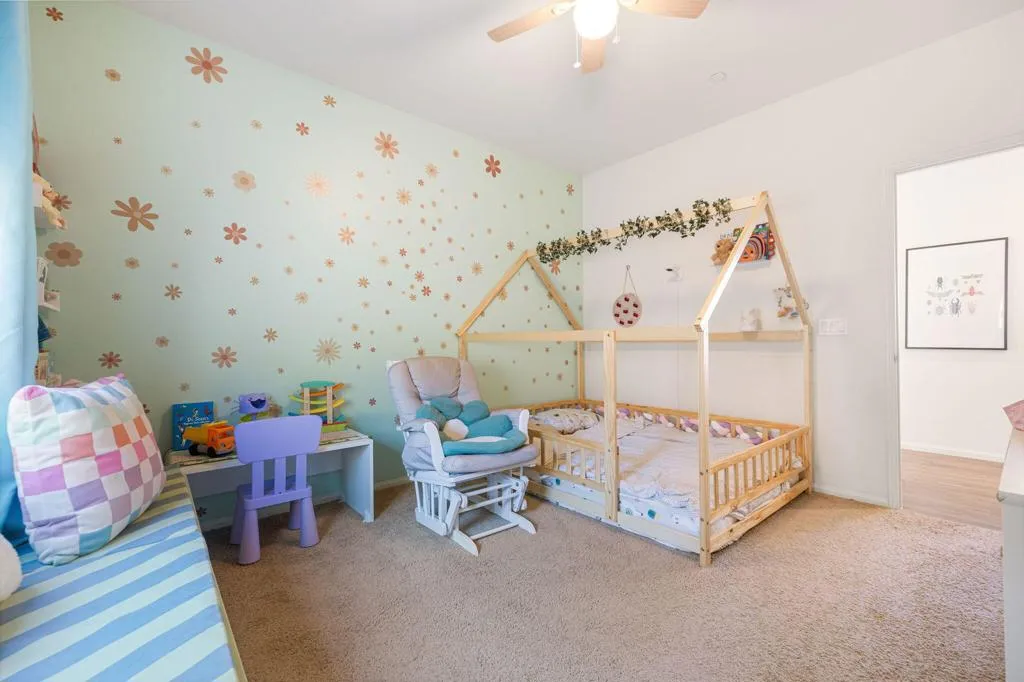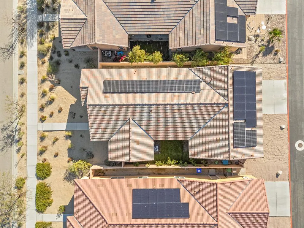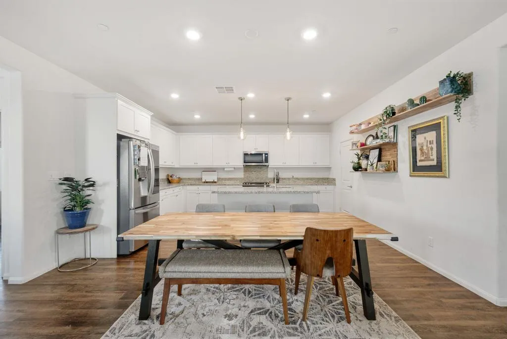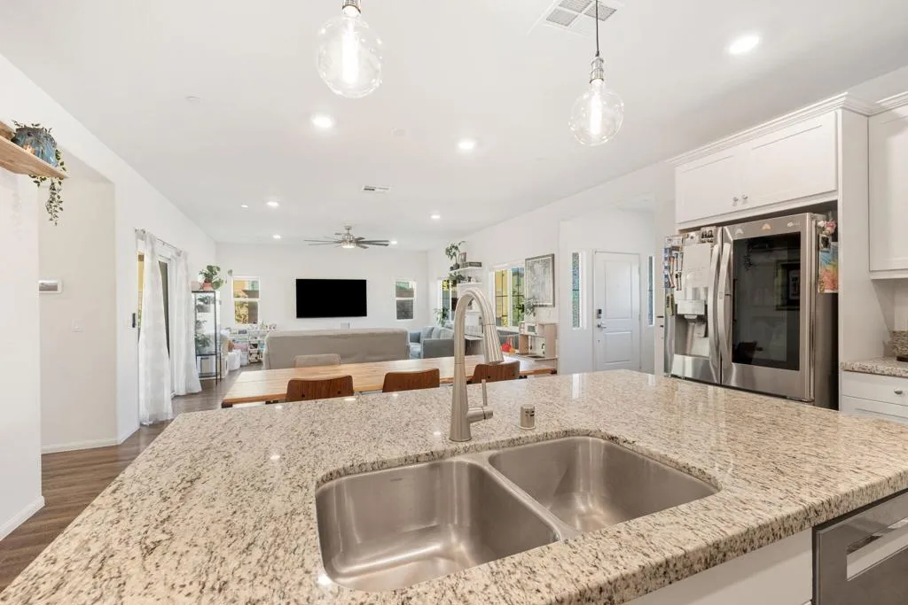 This very stylish 2-bedroom plus den home offers just over 1,800 square feet of thoughtfully designed living space. The den, currently used as a home office, features a striking slat-paneled accent wall and elegant clear glass French doors. The open-concept floor plan creates a seamless flow between the living spaces. The spacious kitchen offers abundant cabinetry, a step-in pantry, a large island with stylish pendant lighting, and opens directly to the expansive living room filled with natural light and garden access. Luxury vinyl flooring runs throughout the main living areas, enhancing both style and durability. Additional highlights include a generously sized laundry room with built-in shelving, leased solar, a tankless water heater, and smart home features. The living room opens to a covered patio and garden area, ideal for relaxing or entertaining. The home also includes an attached two-car garage with a private driveway. Residents of Verano enjoy outstanding community amenities, including a resort-style pool and spa, fitness center, clubhouse, and an expansive gated private park. The park is fully fenced and features a large grass lawn, playground, splash zone, picnic areas, and pickleball courts.