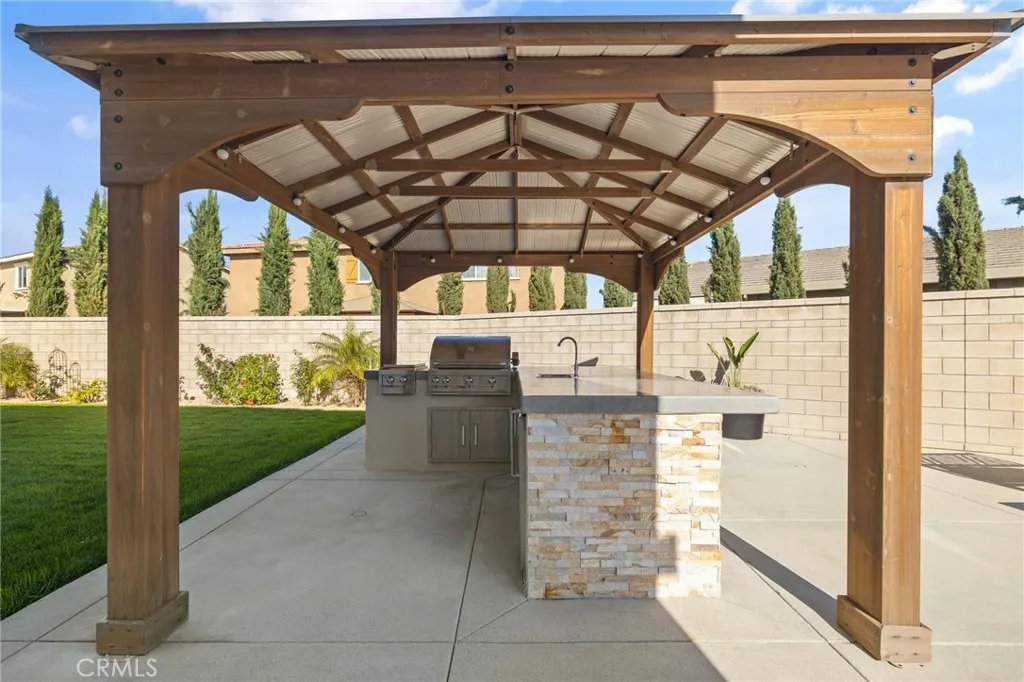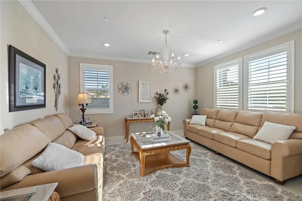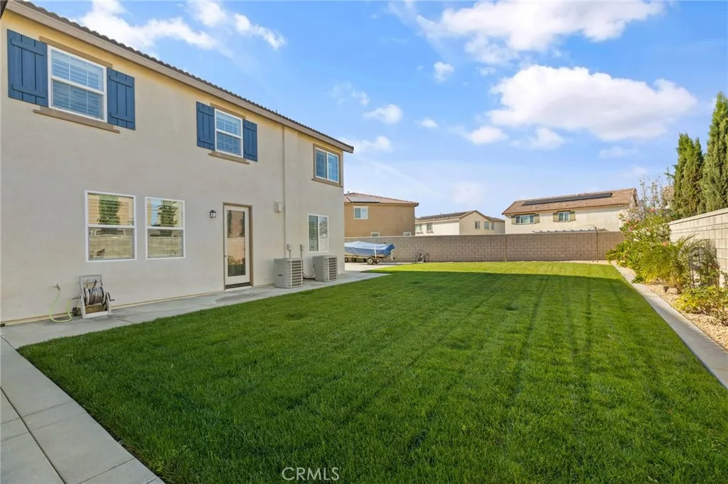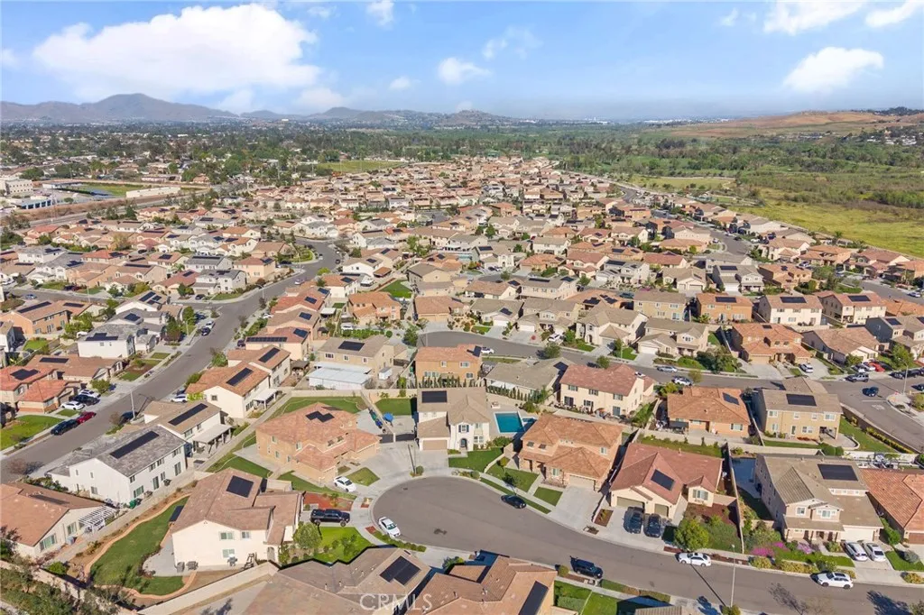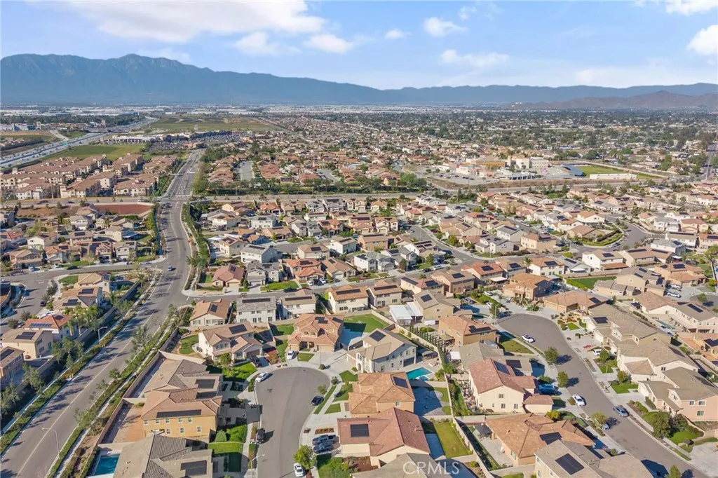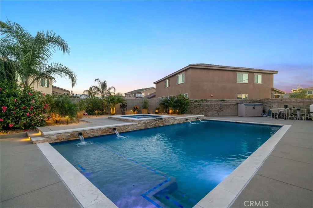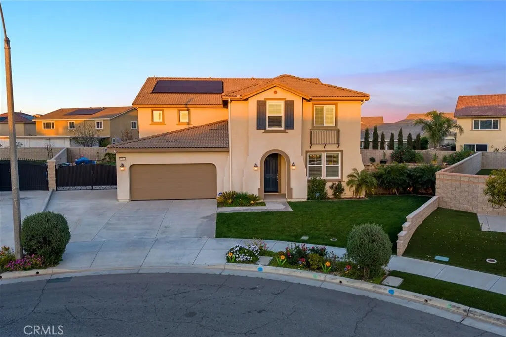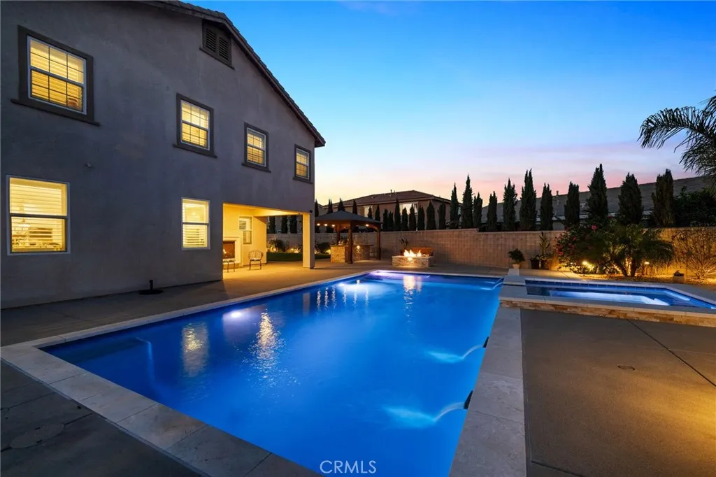 Located in the desirable Riverbend Community of Jurupa Valley, this spacious Lennar-built home was constructed in 2018 and offers 5 bedrooms, 3 bathrooms, and approximately 3,831 sq. ft. of living space on an 11,325 sq. ft. lot. The home features a 3 car attached garage with a tandem space and built-in cabinets for extra storage. The main level includes a formal living room, formal dining room, family room with gas burning fireplace, and a gourmet kitchen with granite countertops, center island with breakfast bar, walk-in pantry, and stainless steel GE appliances including a gas 5 burner cooktop, microwave, double oven, and dishwasher. One bedroom and full bathroom are conveniently located downstairs. Upstairs features a spacious loft, an individual laundry room with sink and built-in cabinets, and a large primary suite with retreat area. The primary bathroom includes dual sinks, vanity area, soaking tub, walk-in shower, private toilet room, and a spacious wrap-around walk-in closet. Interior finishes include porcelain tile flooring in the main living areas and bathrooms, hardwood flooring in all bedrooms, the stairway, loft, and upstairs hallway, and tile flooring in the laundry room and primary bathroom. Additional features include central A/C and heating, dual pane windows, plantation shutters, recessed lighting, reverse osmosis system, and tankless water heater. The backyard is designed for outdoor entertaining and features a California Room with gas fireplace, stainless steel Artisan built-in BBQ, gas fire-pit, automatic sprinkler systems, rain gutters, and gated RV parking with approximately 16 feet of space. Enjoy a resort-style setting with a heated saltwater pool measuring approximately 35’ x 17’ with Aqua Blue Pebble Tech finish, built-in waterfalls, Baja shelf, and an 8’ x 8’ jetted spa. The property also includes 10 solar panels under a 20/20 PPA agreement powered by Sunnova to be assumed by buyer upon close. Families will also appreciate that this home is served by highly regarded schools within the Corona-Norco Unified School District, including River Heights Intermediate School with an 8 out of 10 rating and Eleanor Roosevelt High School with an impressive 9 out of 10 rating according to GreatSchools.org.