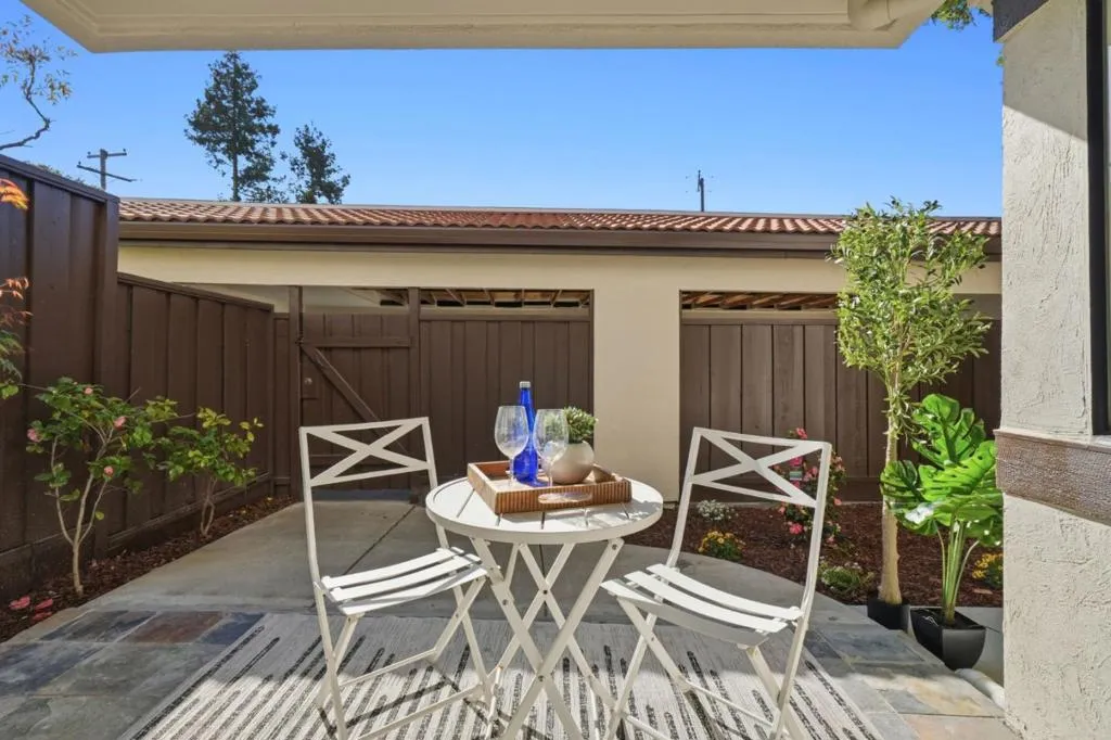 Welcome to Hampton Place, a secure gated community offering a beautifully updated 2-bedroom, 2-bathroom single level lower floor condo with 1,062 square feet. Nestled in a park-like redwood setting with pool, spa, and clubhouse, the community recently completed exterior painting of all buildings. Inside, the home features brand-new kitchen cabinets, quartz countertops, a stainless sink and faucet, all-new appliances including the refrigerator, recessed lighting, and a charming garden window overlooking the grounds. Fresh interior paint and light-blonde laminate wood floors flow throughout and lead to an expansive private backyard patio shaded by towering redwoods with lush plantings, perfect for relaxing or entertaining. The patio gate provides direct access to your assigned covered parking space with nearby guest parking. Both bathrooms have been beautifully remodeled and an in-unit laundry area is included. HOA dues cover water, garbage, sewer, pool and spa, roofs, exterior paint, common areas, and earthquake insurance. Ideally located in the heart of Silicon Valley just minutes to Apple Park, Nvidia, Santana Row, and everyday conveniences including Target, Sprouts, Peets, and Starbucks.