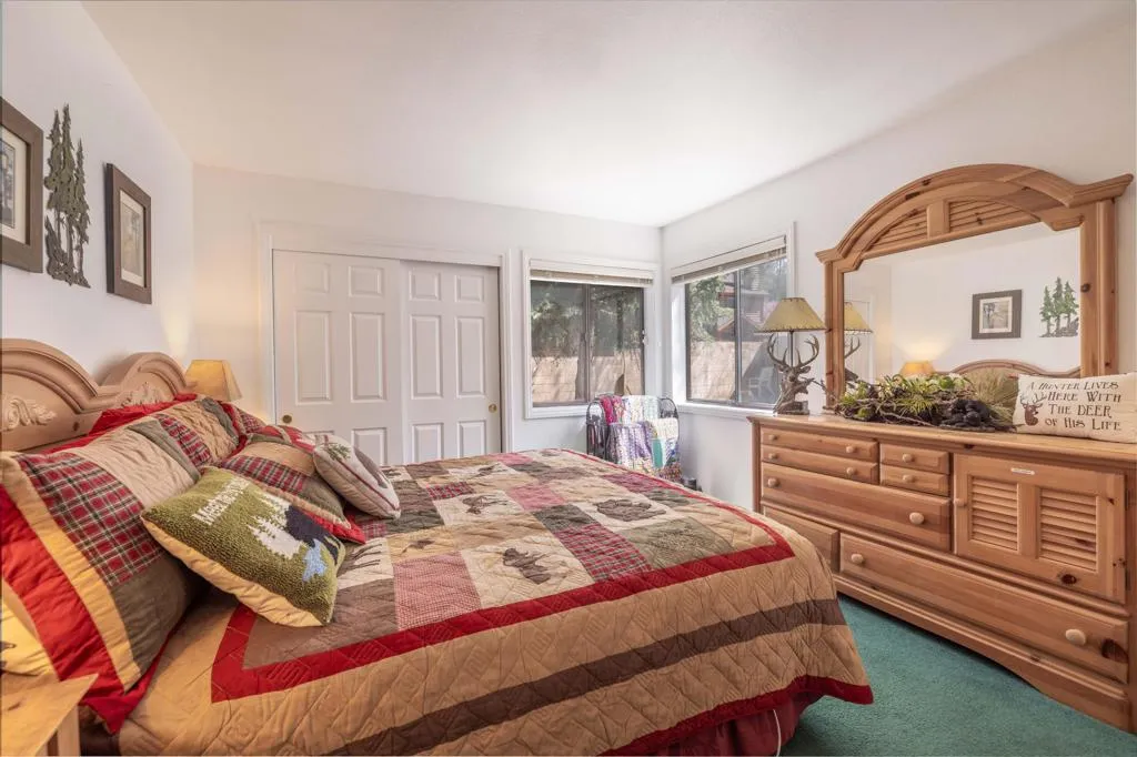 Walk-to-the-Slopes! This spacious Bear Meadows Townhome backs to the 9th hole of the golf course and is a short stroll to Bear Mountain Ski Resort. End unit with largest floor plan in the complex. Two en-suite bedrooms downstairs with living, kitchen, dining and third bathroom on the main floor. The additional loft area upstairs, that's currently being used as third bedroom, delivers room for the whole family and their friends. You'll appreciate the vaulted ceilings, covered deck and attached garage. Premium location with great amenities including tennis court, clubhouse with pool table, hot-tub and fitness center provide year-round fun. Furnishings can be included! Making this turn-key, low-maintenance property one not to miss.