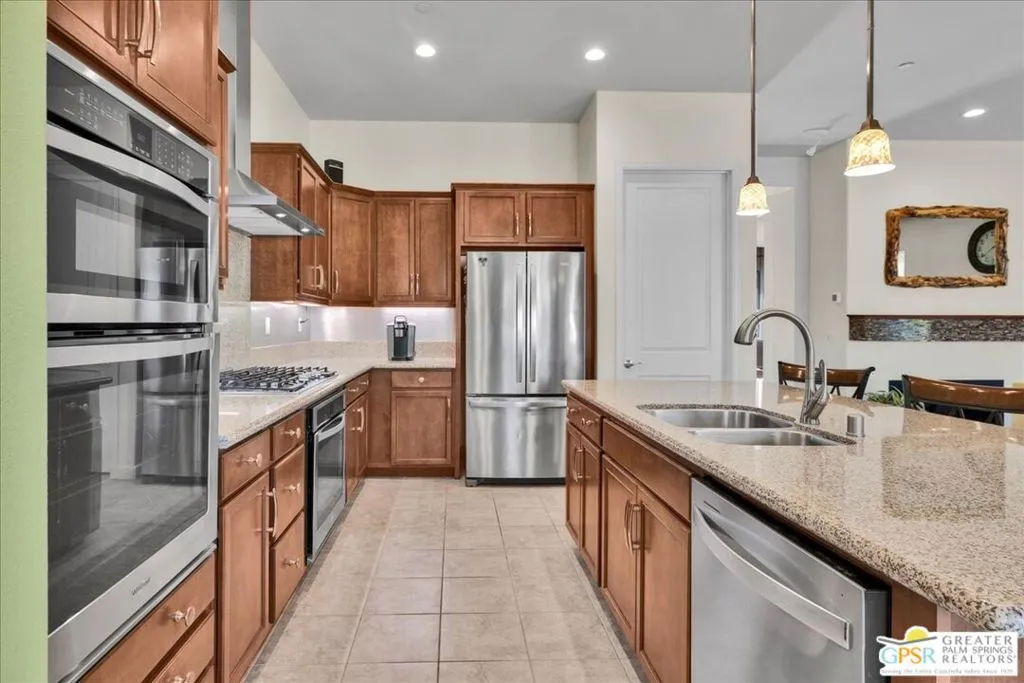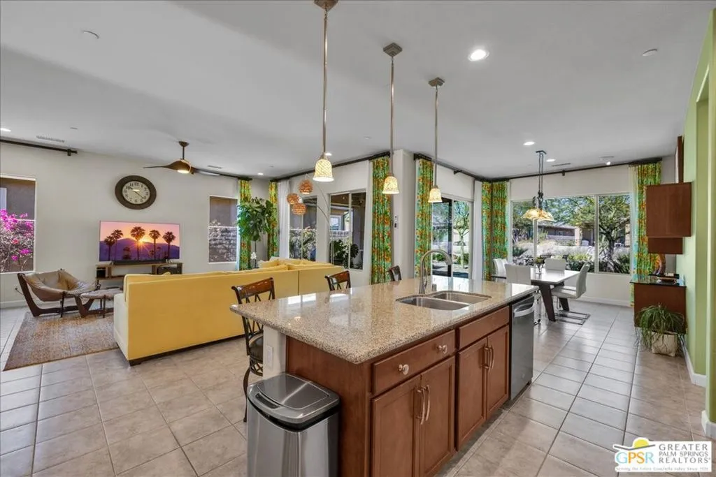 Charming Sanctuary with Mountain & Paseo Views - Del Webb Rancho Mirage. Welcome to this beautifully maintained Phase 1, Plan 4 Sanctuary with Spanish facade, ideally situated along the scenic paseo and perfectly positioned to capture lovely mountain views. Offering 2 bedrooms, 2 baths, and a versatile den/flex space, this home blends comfort, warmth, and easy desert living. Inside, a rich, inviting aesthetic is created through a warm color palette, accent walls, custom window treatments, ceiling fans, and expanded tile flooring that flows seamlessly throughout the home. The kitchen is both functional and welcoming, featuring a Whirlpool chef's package with dual ovens and a 5-burner gas cooktop, natural granite countertops, and hand-selected pendant lighting. Designed for connection and ease, the kitchen opens to the dining and living areas, where an open-concept layout, abundant natural light, and a cozy gas fireplace create the perfect space for everyday living and entertaining. The primary suite is a peaceful retreat, offering beautiful mountain views and a spacious ensuite bath complete with dual vanities, a large stall shower, and a generous walk-in closet. Step outside to the covered patio, where zipper shades provide comfort and flexibility while you take in the serene backyard setting. The fully landscaped yard features mature desert plantings and direct paseo access, creating a tranquil outdoor environment with scenic surroundings. Privately located on the opposite side of the home, the guest bedroom and den/flex space offer comfort and versatility, with easy access to a full secondary bath ideal for visitors, a home office, or a creative space such as a yoga or media room. Additional highlights include leased solar ($101/month), a laundry room with washer and dryer, a climate-enhanced insulated two-car garage with HVAC, and a whole-home water softening system. Located within the prestigious 55+ Del Webb Rancho Mirage community, residents enjoy access to a resort-style clubhouse, fitness center, pool and spa, tennis and pickleball courts, and a vibrant calendar of social activities. HOA dues now include a premium cable and internet package. A peaceful, well-appointed home offering scenic views and effortless desert living.