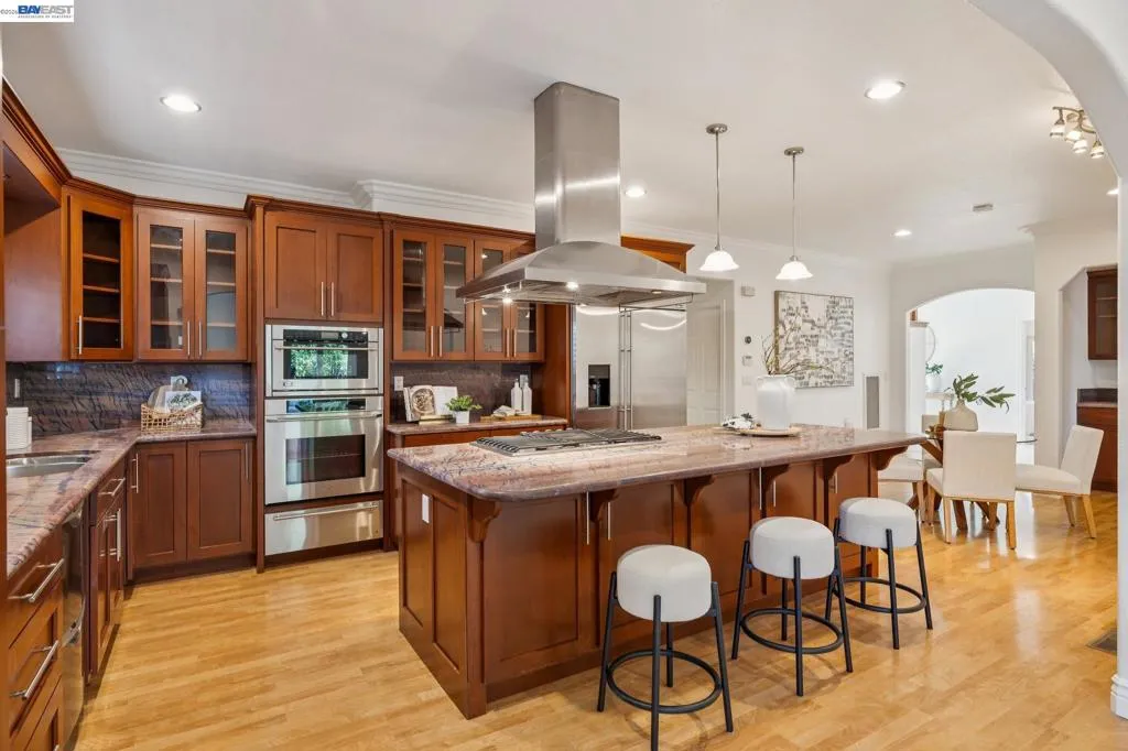 Exceptional custom home in highly desirable San Ramon, located within the award-winning San Ramon Valley School District and walking distance to all three schools. Originally built in 1976, this property was completely rebuilt in 2007 on a new foundation to meet modern building standards. Situated on a premium corner lot with no neighbors on three sides, this home offers added privacy and abundant natural light. Spacious and functional floor plan includes a bedroom with a full bath on the main level, ideal for guests or multigenerational living. All bedrooms feature walk-in closets. Home offers 5 full bathrooms and 1 half bath, including multiple jetted tubs. The gourmet kitchen features a seamless single-slab granite countertop, a butler’s pantry with a sink, and dual refrigerator drawers. The upstairs den includes a convenient kitchenette with a sink and space for a mini refrigerator. Additional features include whole-house internet wiring with a centralized control panel, built-in concealed speakers in the family room and upstairs den (7.1 surround sound), a central vacuum system, dual-zone HVAC, and an entry chandelier with a motorized lowering system for easy maintenance. The garage includes custom wall-to-wall cabinetry for ample storage.