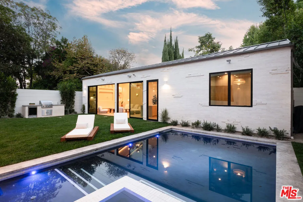 Introducing a newly built Deco Revival inspired modern estate in the heart of Sherman Oaks, ideally located South of the Boulevard and moments from top restaurants, shops, and cafs. Crafted with elevated materials and refined organic texture elements, this residence blends timeless Art Deco elegance with contemporary California living. The exterior features natural stone, brick, and smooth stucco, creating a striking architectural presence. Once inside, custom oak cabinetry, hand-crafted oak ceiling beams, and European natural stone countertops set a sophisticated tone. Upon entering, the main floor unfolds with a seamless flow through spacious, open concept living. Natural light fills the space where expansive living and dining areas flow seamlessly into the gourmet kitchen. The chef's kitchen is equipped with premium Thermador appliances, European stone countertops, bespoke fixtures, and a large island designed for cooking, gathering, and everyday living. Curved architectural lines and thoughtful lighting, elevate the ambiance with refined soft deco influence. A desirable first-floor ensuite bedroom provides flexibility for guests or a private office, while a spacious theater offers an ultimate cinematic experience. Upstairs, there are four additional ensuite bedrooms, including a luxurious primary suite with vaulted ceilings, custom walk-in closet, private balcony overlooking the outdoors and a spa-inspired bathroom featuring premium finishes and marble countertops. Thoughtfully designed for comfort and privacy, each bedroom enjoys its own beautifully finished ensuite bathroom and custom closets. Make your way outside to the backyard oasis, offering a resort-style pool and spa, outdoor BBQ island and room for alfresco dining and entertaining. The 1 bedroom, 1 bathroom ADU is the perfect place for extended family, friends who are visiting or your home studio.