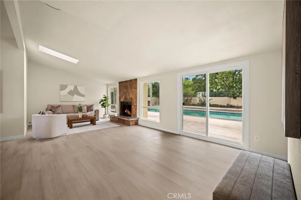 Fully Remodeled Granada Hills Retreat with Pool, Large Lot & ADU Potential! Welcome to this completely reimagined home that has been remodeled from top to bottom, offering modern style, comfort, and exceptional outdoor living in a desirable cul-de-sac location. Step inside to a bright and airy interior filled with natural light pouring in through skylights, creating a warm and inviting atmosphere throughout. The thoughtfully updated layout features a spacious living room with a cozy fireplace that opens directly to the backyard, perfect for seamless indoor-outdoor living and entertaining. The upgraded kitchen showcases stainless steel appliances, sleek finishes, and ample space for cooking and gathering. Bathrooms have been tastefully redesigned, featuring both a shower-in-tub and separate walk-in shower surrounded by stone in the bathroom suite, delivering a spa-inspired experience. Situated on a generous lot just over 12,000 sq ft with its private backyard, the outdoor space is truly a standout. Enjoy a large sparkling pool, a covered backyard deck ideal for dining and lounging, and fresh new landscaping that enhances both privacy and curb appeal. One of the key benefits of the property is its convenient location, offering walking distance access to both the elementary school and the nearby junior high. Adding even more value, the expansive lot offers additional land with space to build an ADU, creating an incredible opportunity for rental income, multi-generational living, or a private guest retreat. With its complete remodel, oversized lot, entertainer’s backyard, and future development potential, this home is a rare offering in Granada Hills. Schedule your private showing today and experience it firsthand!