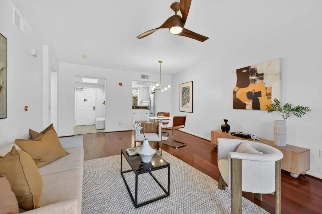 Stylishly updated home in the gated Midtown Plaza community overlooking O'Connor Park. Fresh interior paint, freshly painted kitchen cabinets, and laminate flooring highlight the open living space with granite countertops, stainless steel appliances, a brand new dishwasher, new in-unit washer/dryer, and a brand new modern contemporary ceiling fan and lighting fixture. The renovated bathroom features a sleek shower stall with niche and infinity drain. The bright bedroom offers abundant natural light and a walk-in closet with built-in shelving. Enjoy a private balcony with peaceful park views. Community amenities include pool, fitness center, clubhouse, and secure underground parking with elevator access. Convenient to Hwy 280, Santana Row, Valley Fair, shops, restaurants, and cafes.