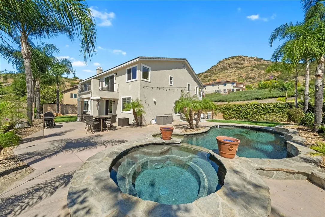 *PRIVATE POOL & SPA * STUNNING VIEWS * PRIVACY * LARGE LOT * GUARD-GATED COMMUNITY Set near the highest point in Greer Ranch on an expansive 11,761 sq ft lot, this exceptional 3,806 sq ft home showcases sweeping views of the Santa Rosa Plateau & Temecula Valley, with only one home above it. A long driveway, new landscaping, freshly painted exterior, updated wrought-iron glass front door & 3 car garage create a striking first impression. Inside, soaring 2 story ceilings, luxury vinyl plank floors & neutral interior paint set the stage, while the formal living & dining rooms are filled with natural light from expansive windows. The kitchen features granite counters, white cabinetry, stainless steel appliances & a walk-in pantry, opening to a beautifully updated farmhouse-style family room with shiplap accent wall, remodeled fireplace with wood mantle, custom built-in with floating shelves, recessed lighting, ceiling fan & dry bar with tile backsplash & beverage fridge. A wall-to-wall roll-up screen with hidden projector adds a fun touch for movie nights. The main floor offers a bedroom with ceiling fan & walk-in closet & includes an attached bath with walk-in shower, ideal for guests or multi-gen living, along with an additional upgraded 1/2 bath & laundry room with sink & abundant cabinetry off the 3 car garage with epoxy floors & hi-loft storage. Upstairs offers 3 secondary bedrooms (2 of them a Jack-n Jill), 2 baths & a large bonus room with wood floors, barnwood door entry & balcony. Privately situated away from the secondary bedrooms, the primary suite features double door entry, its own private balcony with stunning views, jetted tub, walk-in shower, make-up vanity & large walk-in closet. The backyard is a private haven with a saltwater pool & spa with fire bowls, grassy area, horseshoe pit & patio spaces to relax or entertain. Additional features include a Quiet Cool whole house fan, attic fan, NEST cameras & ADT pool security system. Located within the guard-gated Greer Ranch community with 24 hr security, scenic hiking & biking trails, parks, community pool & spa, and year-round neighborhood events. Enjoy convenient access to the 215 & 15 freeways, nearby shopping & dining, Old Town Temecula, Temecula wineries & the Promenade Mall, all w/in the highly regarded Murrieta school district. Don't miss this rare opportunity to own a pool & view home that blends privacy, space & everyday luxury.