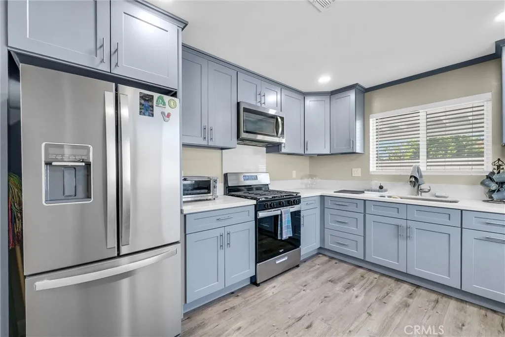 Turnkey home with a newer detached ADU and additional studio conversion, offering excellent flexibility and income potential. Per assessor, the property is a 4-bedroom, 2-bath home, with the main residence and ADU each configured as 2-bedroom, 1-bath units. This property can comfortably house 2 families. Both units are outfitted with all energy efficient lighting and appliances. The detached ADU, built approximately 2.5 years ago, features a private entrance, full kitchen, and laundry hookups, providing a fully independent living space. The garage has been converted into a studio with a kitchenette and bathroom, offering additional functional space for extended living or potential rental use. Situated on a large lot, the property offers RV parking and ample space for multiple vehicles. The grounds are fully enclosed with block walls and gated access for added privacy. Both the main home and ADU are equipped with newer AC units. The front home also features a newer roof. Low-maintenance, drought-tolerant landscaping enhances overall efficiency and curb appeal. Ideal for owner-occupants or investors seeking a versatile property with multiple living spaces and strong income potential.