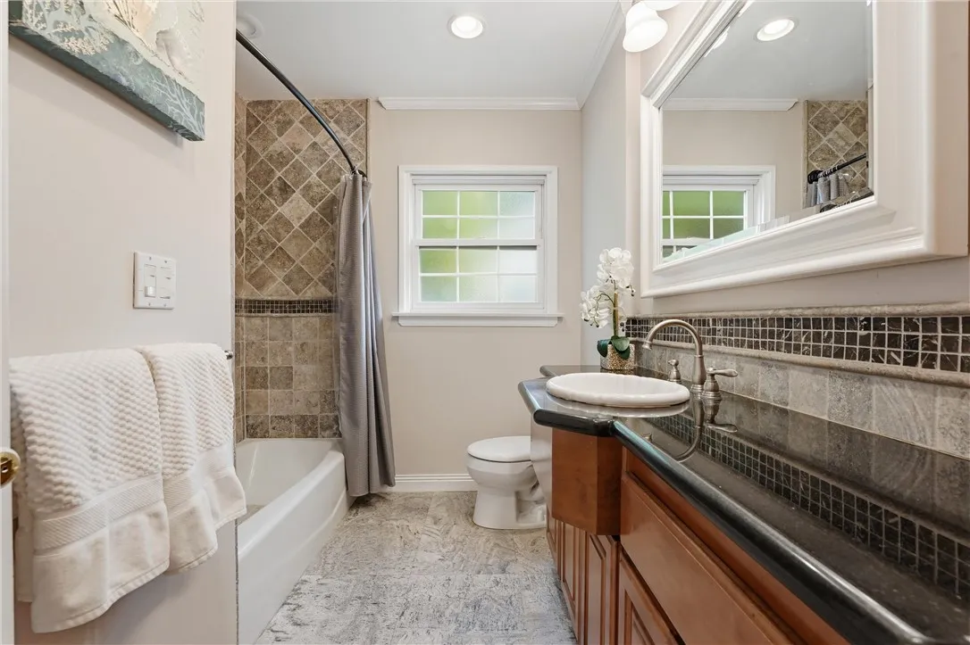 TRADITIONAL FAMILY NEIGHBORHOOD - This well-maintained, three bedroom home has an open floor plan with high quality at every turn. Travertine floors, granite countertops, custom cabinetry, vinyl dual-paned windows and two sliding doors, recessed lighting, custom glass entry door, living room fireplace, and crown molding. Covered patio with laundry hookups. Extended concrete driveway with a secure wrought-ironed gate, leads to the two car, detached garage. Generous sized backyard with lush landscaping. This home offers welcoming curb appeal, from the beautiful orange tree out front, to the warm natural light that enters the property.