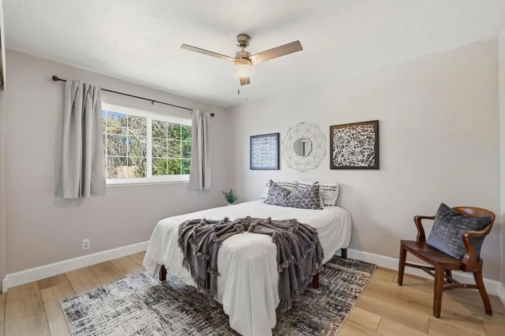 Space & thoughtful updates come together in this 4 bedroom, 2.5 bathroom home offering 2,016 sq ft of living space. The kitchen was remodeled in 2021 & features a 6 burner gas stove, stainless steel appliances, cabinet depth refrigerator, recessed lighting, & a large window bringing in natural light while opening to the dining area. The dining space centers around a fireplace with mantel & includes recessed lighting & a sliding glass door to the backyard. The living room welcomes you with a bay window, recessed lighting, & ceiling fan, while the separate family room adds volume & character with a vaulted ceiling. The primary suite is located on the ground floor. Double doors open to the bedroom, which features a wall to wall closet while the primary bathroom includes dual sinks & a walk in tile shower. An office sits at the front of the home, providing a dedicated workspace. All bedrooms include ceiling fans. Flooring updates include new LVP installed downstairs in 2021 & upstairs in 2026, complemented by 6 inch white baseboards. Additional improvements include a replaced furnace in 2018, fully paid solar added in 2013, & updated electrical circuits & breaker panel in 2021. The backyard is designed for low maintenance enjoyment with cemented areas & a pergola for shaded seating.