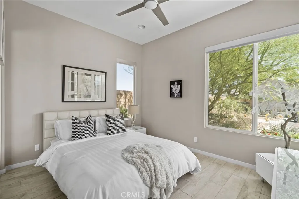 Welcome to your private desert retreat located in the highly desirable Escena Golf Club community in Palm Springs. This beautifully designed 2 bedroom + office/den, 2.25 bathroom home offers the perfect blend of modern comfort and effortless indoor-outdoor living. Step inside to an open-concept floor plan filled with natural light, soaring ceilings with exposed beams, and clean contemporary finishes throughout. The spacious kitchen features sleek cabinetry, a large center island with seating, and seamless flow into the dining and living areas—ideal for both everyday living and entertaining. The primary suite offers a serene escape with a spa-inspired bathroom, dual vanities, and a walk-in shower. A versatile office/den provides the perfect space for working from home, a guest room, or creative studio. Designed for true Palm Springs living, the backyard is a private oasis complete with a sparkling pool and spa, multiple lounge areas, and lush landscaping—perfect for relaxing or hosting under the desert sky. Located within Escena Golf Club, residents enjoy a beautifully maintained community centered around a stunning Nicklaus Design golf course, with convenient access to dining, recreation, and all that Palm Springs has to offer.