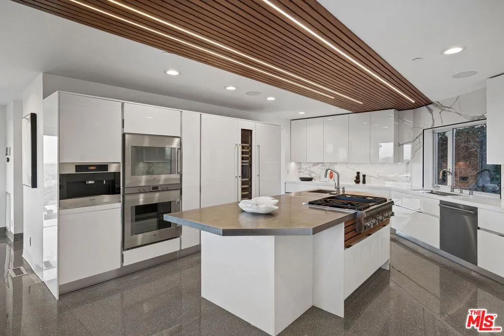 This sleek, contemporary home embodies the epitome of Los Angeles sophistication, with breathtaking jetliner views from downtown to the ocean. Located on a quiet cul-de-sac, the property features expansive Fleetwood pocket doors that seamlessly connect the open-plan living spaces to the impressive outdoor areas, including a pool, infinity spa, waterfall, significant grassy area with fireplace, lounge chairs and al fresco dining area with built-in bbq. The chef's kitchen is outfitted with Gaggenau and Miele appliances, Caesarstone countertops, a wine fridge, and a wine cellar. Upstairs, the luxurious master suite offers a beautiful fireplace and panoramic views from its glass walls and wraparound balconies. The spa-like master bath includes a steam shower, heated floors, liquid crystal privacy, his/her closets, and a hidden flat-screen TV in the vanity mirror. The home is fully equipped with advanced smart technology, including a Vantage automated system, multi-zone Sonos sound system, keyless entry, and security cameras.
