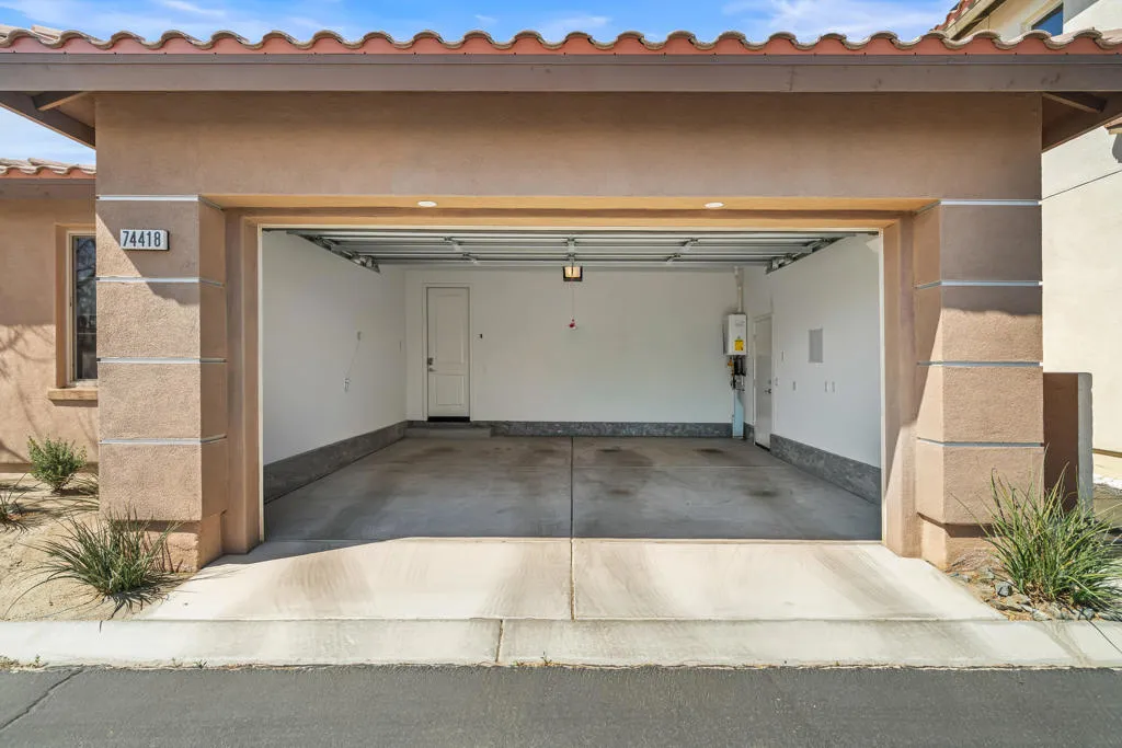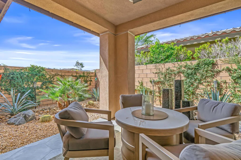 Welcome to Genesis, a gated, modern community in the heart of Palm Desert. Located at 74418 Millennia Way on a desirable corner lot, this beautifully upgraded residence offers 2 bedrooms, 2 bathrooms, and a versatile den featuring top-of-the-line steel sliding doors by Crystalia Glass, perfect as a third bedroom, private office, or media space. Every detail has been thoughtfully designed to create a bright, open, and functional living environment ideal for today's sophisticated lifestyle.The open floor plan is filled with natural light, soaring ceilings, and a soothing neutral palette, enhanced by upgraded automatic shades throughout. The gourmet kitchen serves as the heart of the home, featuring a large center island with breakfast bar seating, stainless steel appliances, and a stylish, contemporary backsplash. It flows seamlessly into the spacious great room, perfect for entertaining, family gatherings, or relaxed everyday living.The primary suite is a true retreat, featuring a walk-in closet, dual vanities, and a large, open, zero-entry shower with modern tile and glass accents that exude both luxury and functionality. The secondary bedroom offers flexible elegance, ideal as a private guest suite or an inspiring craft or studio space.Step outside to a private backyard oasis featuring professionally designed landscaping and fountains by Teserra, a covered patio with a misting system, firepit, conversation area, greenspace, and peek-a-boo mountain views,all with low-maintenance design for effortless desert living. Additional convenience comes from a Wi-Fi controllable garage system for modern living.Genesis provides resort-style amenities including a sparkling community pool and spa, fitness center, dog parks, walking trails, gated entry, front yard maintenance, and included cable and internet. Ideally located near world-class shopping, dining, golf, Acrisure Arena, and with easy access to I-10, this home blends luxury, comfort, and convenience in one of Palm Desert's most sought-after communities.