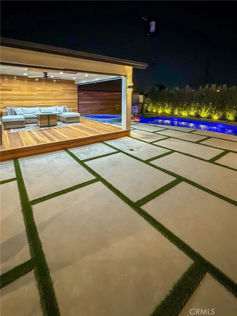 Modern Sophistication Meets Resort-Style Living in this FULLY FURNISHED beauty! Experience the pinnacle of contemporary design in this meticulously upgraded residence. From the curb, the home impresses with a sleek facade featuring natural wood siding, smooth stucco, and a designer glass-inlay front door. Step inside to an open-concept sanctuary defined by brilliant white marble-style flooring, recessed LED lighting, and a skylight that floods the space with natural light. Home also has an upgraded solar system to minimize your utility bill! The chef’s kitchen is a masterpiece of form and function, boasting custom charcoal-textured cabinetry, striking quartz countertops with a waterfall edge, and professional-grade stainless steel appliances—including a built-in wine cooler. The living area serves as a perfect focal point with its custom-finished accent wall and integrated media center. The backyard is an entertainer’s dream, featuring a massive covered deck with warm wood paneling that transitions seamlessly into a geometric hardscape with integrated turf. Relax by the sparkling pebble-tec pool and spa, surrounded by lush privacy hedging and designer lighting. This is more than a home; it’s a private retreat.