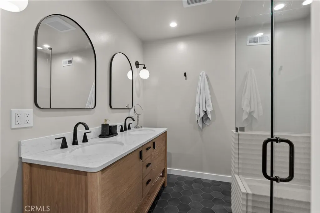 Located on a beautiful interior street in the desirable Century Park neighborhood, this fully upgraded turnkey home offers clean design and effortless indoor-outdoor living. A charming Dutch door opens to a light-filled interior with vaulted ceilings, new luxury vinyl flooring, custom built-ins, and recessed lighting throughout. Upon entry, the open layout includes a welcoming family room, dining area, and remodeled first-floor bathroom. The kitchen features an exposed wood beam ceiling, granite countertops, stainless steel appliances, and opens directly to the main living spaces. Large sliding doors create a seamless connection to the backyard from the main living areas, while the office also opens to a private side yard Trex deck for an additional outdoor area. The main-level primary suite includes direct backyard access and a remodeled en-suite bath with an expanded walk-in shower and smart toilet. Upstairs, you’ll find three secondary bedrooms and a remodeled hall bathroom. Custom closets in the primary and secondary bedrooms provide upgraded storage. The backyard is designed for both entertaining and everyday enjoyment, complete with a pool, spa, multiple seating areas, and mature landscaping for added privacy. Exterior improvements include fresh paint, an Ipe wood front fence, new landscaping with irrigation, updated driveway and pavers, and upgraded front and garage doors. The home also includes upgraded A/C and additional system improvements. Ideally located in Fountain Valley, just minutes from Huntington Beach, top-rated schools, shopping, and dining.