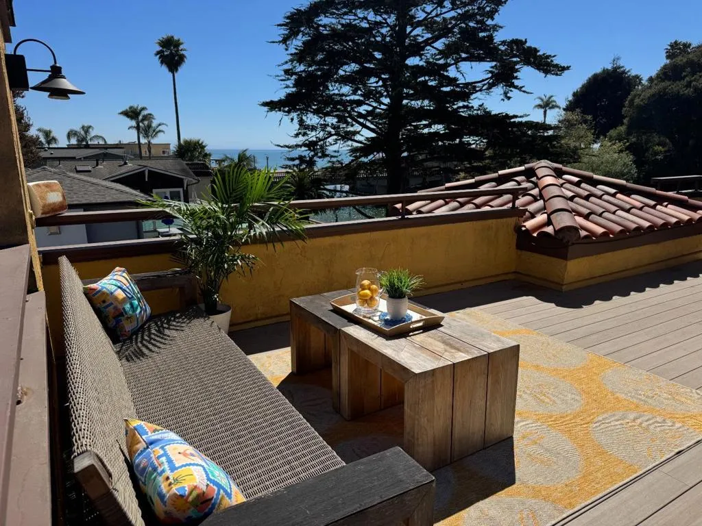 Stunning ocean and creek views framed by majestic cypress branches, the iconic Capitola Village Bridge and the Soquel Creek Trestle. The top floor-vista is topped by 365-degree roof-top deck views. This is the only roof top decks as far as the eye can see. And no-one can see you either. One of three units that share a gated private creekside beach with fire pit and boat launch. If you are looking for a private castle, a family retreat, or a lucrative vacation rental this gem has it all. Quiet and tucked away, yet less than a block away from fine dining, the local favorite ice cream shop, and hot slices made to order, the quaint Capitola Village rivals any European Beach town. Fully-wired custom engineered smart home with Gigabit ethernet, top to bottom synchronized sound, and ReoLink cameras. One car garage plus one carport.