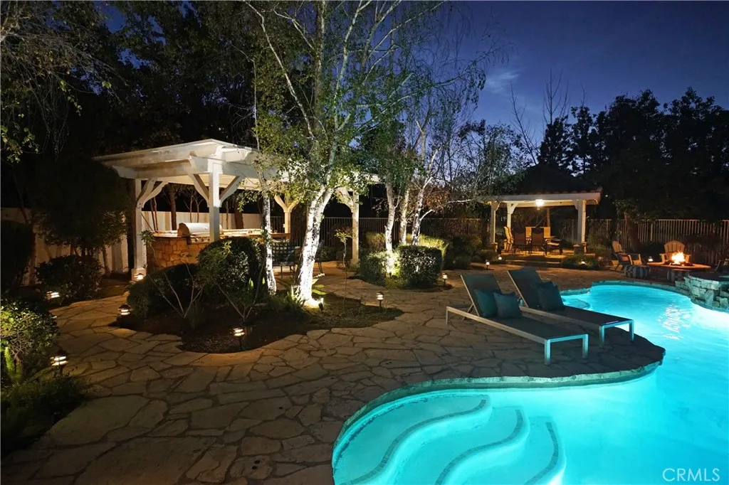 If I told you that you could live in a Calabasas home, in a guard gated community, with an amazing, spacious, entertainers backyard (pool, spa, outdoor kitchen, 2 gazebos - very rare for Calabasas Hills) and all the bedrooms have en-suite bathrooms - What would you say? Welcome to 24751 Calle Largo—where comfort, craftsmanship, and resort-style living come together in one of Calabasas’ most desirable gated communities. Thoughtfully renovated over the past 11 years, this exceptional home showcases quality upgrades and custom features throughout. The beautifully redesigned kitchen is the heart of the home, featuring custom cabinetry with pull-out pantry storage, a farmhouse sink, stainless steel appliances, and a one-of-a-kind built-in wood and glass dining table that comfortably seats up to eight—perfect for everyday living and entertaining alike. The home offers a highly desirable floor plan with expanded bedrooms, each with its own en-suite bathroom, providing both privacy and flexibility for family and guests. The luxurious primary suite is a true retreat, complete with a newly built spa-inspired bathroom featuring a rainfall showerhead and steam shower, along with a custom walk-in closet designed for maximum organization and storage. Throughout the home, you’ll find travertine, tile, and wood flooring, granite countertops in all spaces, and fresh interior paint—creating a warm, updated, and move-in ready environment. Step outside to your own private resort. The fully renovated backyard is designed for both relaxation and entertaining, featuring a sparkling pool and spa, an outdoor kitchen with built-in BBQ, sink, refrigerator, and granite counters, plus a spacious gazebo dining area ideal for hosting gatherings. Lush privacy landscaping enhances the serene and peaceful setting, while a fire pit adds the perfect touch for evening enjoyment. Ideally located, the home is just a short distance to Bay Laurel Elementary School within the award-winning Las Virgenes School District. Enjoy the convenience of nearby Calabasas Commons for shopping, dining, and community events, along with exclusive access to Calabasas Lake. The neighborhood also features a park and playground, all within the security of a gated community. This is more than a home—it’s a lifestyle. A place where years of cherished memories have been made, and where the next owner can enjoy comfort, privacy, and the best of Calabasas living.