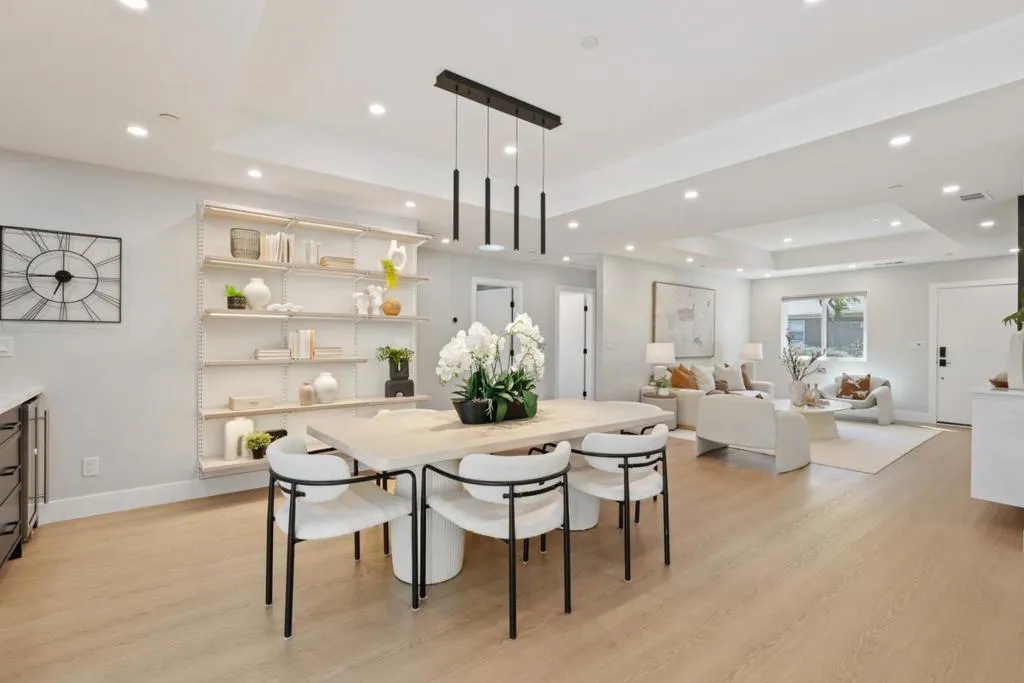 rebuilt from the foundation in 2024, this sleek contemporary home offers modern design and exceptional versatility with a fully independent detached ADU completed in 2022. Clean lines, a glass-panel garage door, and a striking blue entry set the tone for stylish interiors throughout. The main home features 3 bedrooms and 2 baths centered around an open-concept great room with a geometric tile fireplace, floating cabinetry, and seamless indoor-outdoor flow via sliding glass doors. The designer kitchen showcases navy and white cabinetry, marble-style quartz counters, stainless steel appliances, and a spacious island with seating. A formal dining area with open shelving and wine bar enhances functionality. The primary suite offers a custom walk-in closet and spa-like bath with freestanding tub, frameless shower, and dual vanities. Two additional bedrooms share a hall bath. An attached 1-car garage includes laundry. The detached 1-bedroom, 1-bath ADU (1948 Hackett Ave) features a full kitchen, living area, laundry, and mini-split HVAC ideal for guests or rental income. Low-maintenance synthetic lawns and landscape lighting complete the property. Ideally located one block from Rengstorff Park, near Castro Street and San Antonio Center, with access to top Mountain View schools.