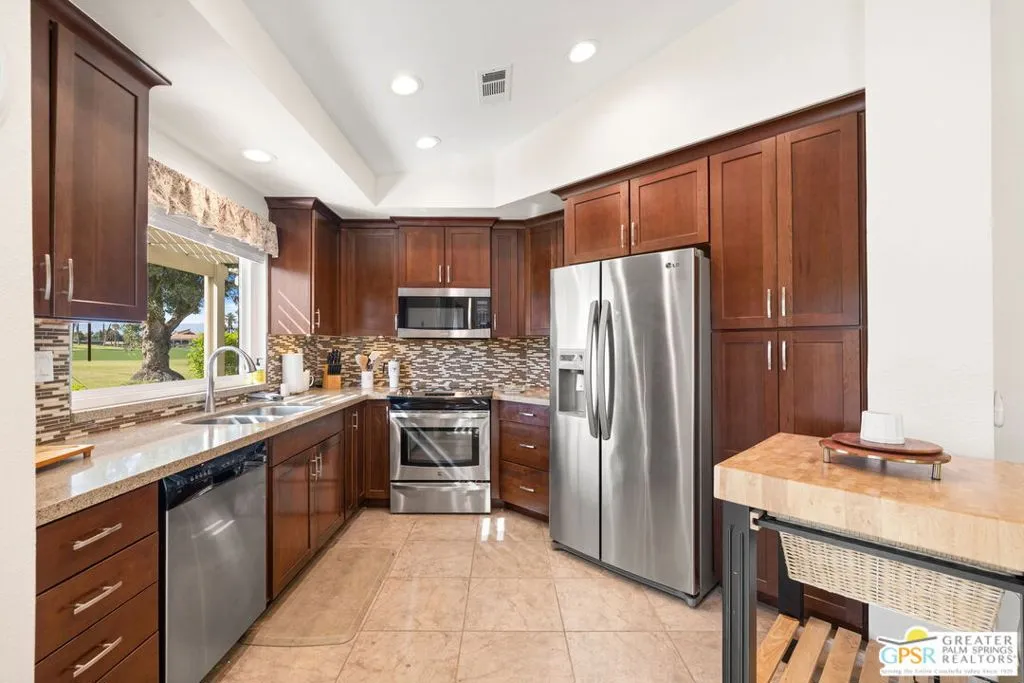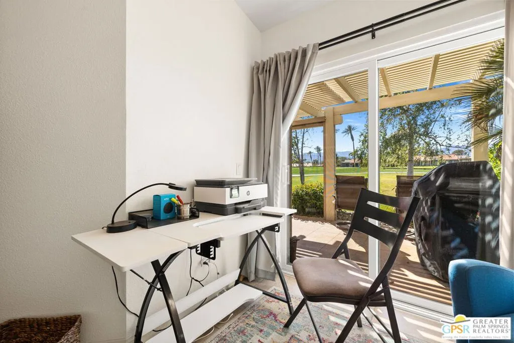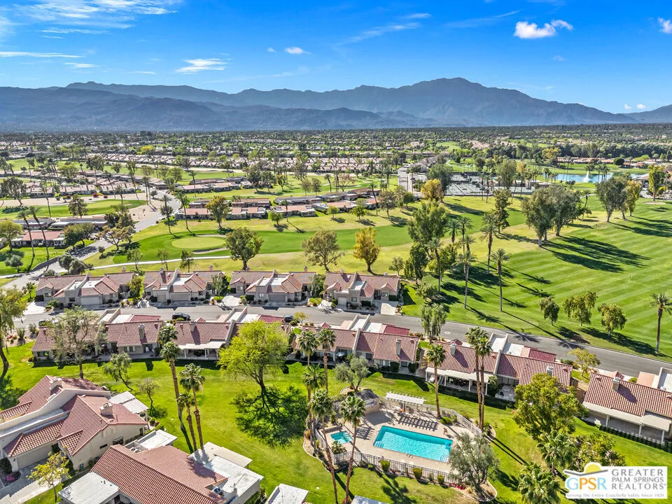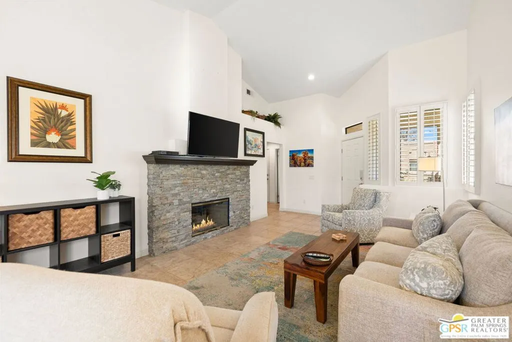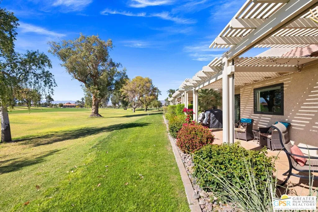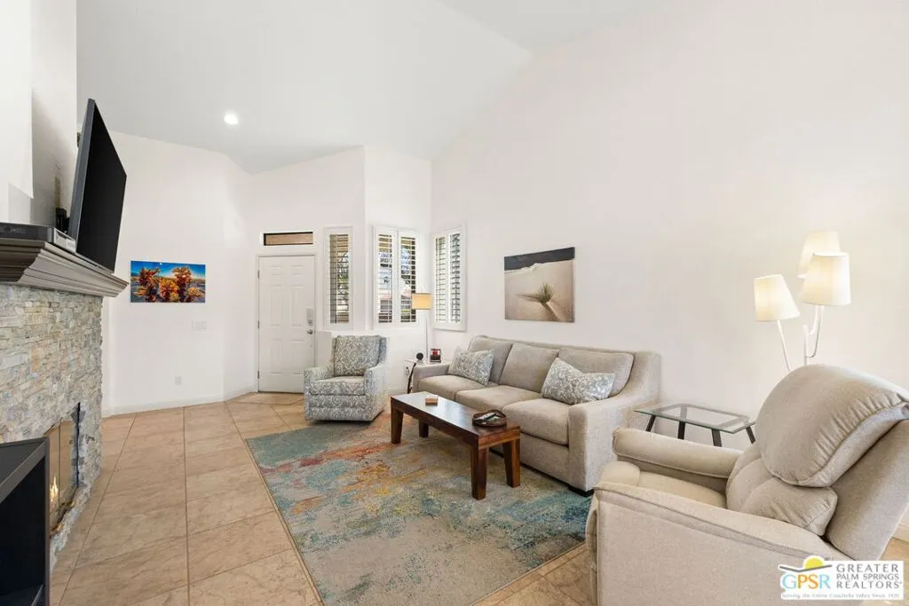 Introducing this beautifully updated and expanded Augusta model, ideally positioned just off the 1st green of a well-maintained 18-hole championship course, offering sweeping mountain, golf course, and clubhouse views. Thoughtfully designed with a cohesive open-concept layout, the great room showcases soaring vaulted ceilings, plantation shutters, custom window treatments, and a striking stacked stone fireplace, flowing seamlessly into an enlarged dining area.The kitchen blends style and functionality with granite countertops, stainless steel appliances, a glass tile backsplash, and soft-close custom cabinetry. It has also been fully upgraded along with all windows and doors throughout the home, enhancing both efficiency and comfort.Both bathrooms have been tastefully remodeled, including a reimagined primary suite bath featuring a walk-in shower. Tile flooring and skylights run throughout, creating a bright, airy atmosphere.Step outside to an extended patio with an Alumawood cover, thoughtfully designed with a raised section to maximize the views, along with electronic drop-down shades which is perfect for entertaining or unwinding while enjoying stunning desert sunsets.Offered tastefully furnished for a seamless move-in experience, this home is complete with an attached garage featuring epoxy flooring. The Palm Desert Resort Country Club has a beautiful clubhouse, Coachella Valley's premier pickleball and tennis club, and an award-winning golf course. The resort is a very active community with a clubhouse (includes formal dining, a lounge, and a pro shop), and 20 pools and spas. This is an exceptional desert retreat combining comfort, quality, and location.