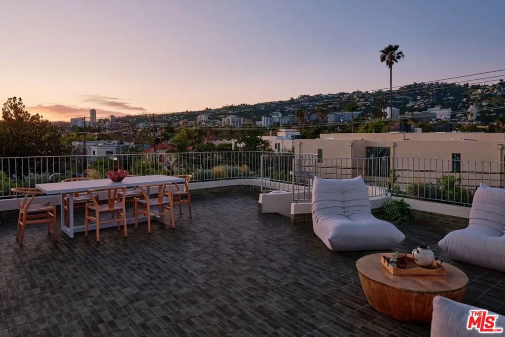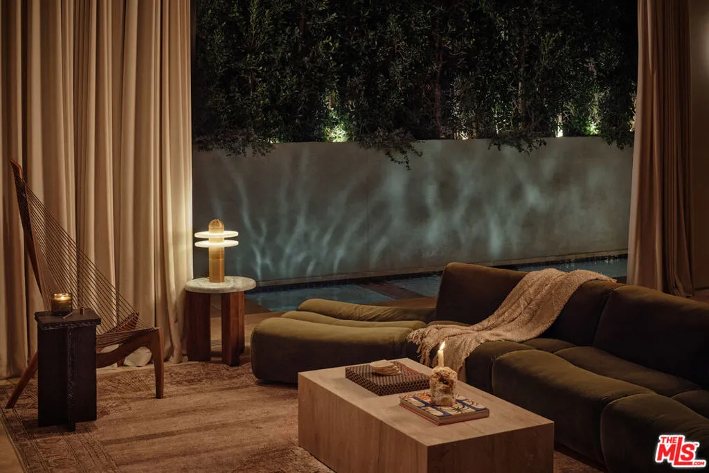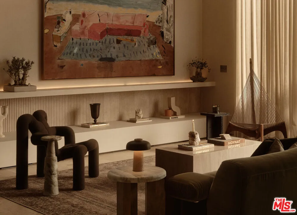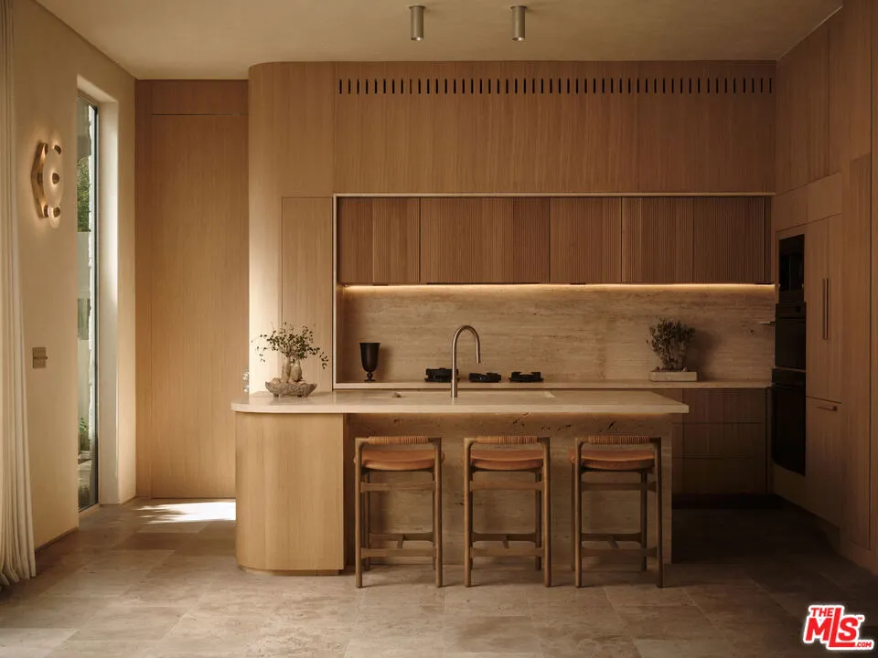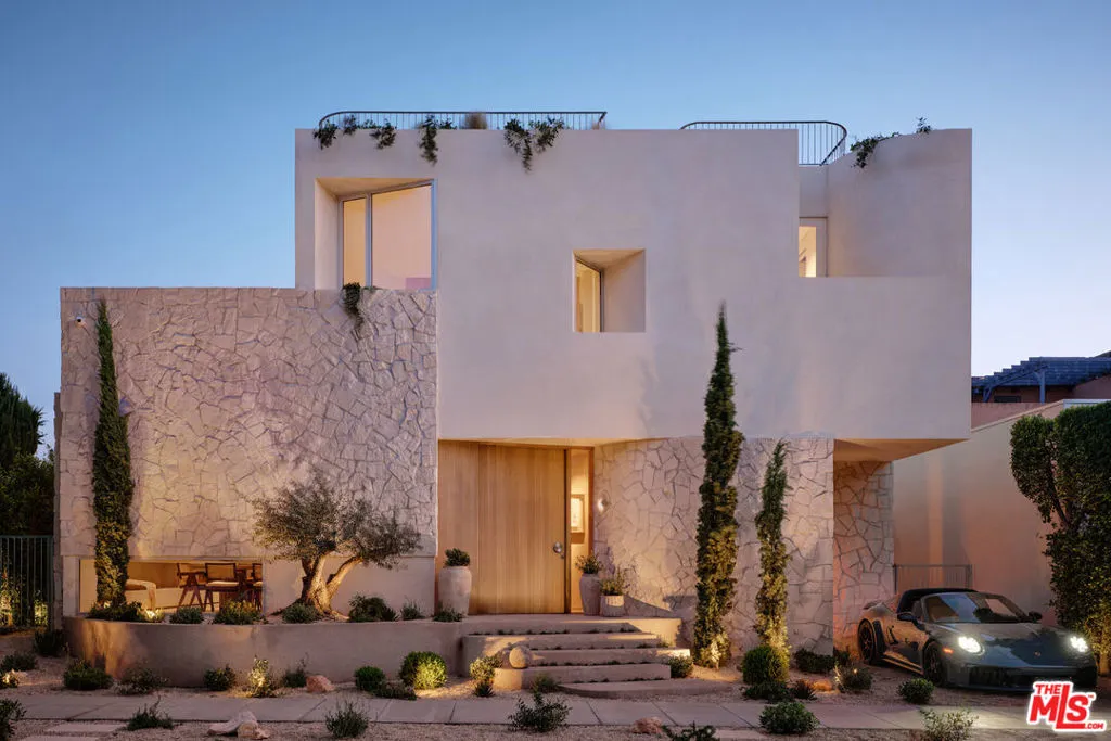 An architectural home defined by craftsmanship, materiality, and atmosphere in a highly coveted West Hollywood enclave. This 3 bedroom, 3.5 bath home balances flowing curves with luxurious interiors and a highly refined material palette. Travertine floors and surfaces, custom white oak cabinetry, and hand-applied plaster walls create depth and continuity throughout, while natural light moves seamlessly across the interiors, emphasizing texture, curvature, and proportion. Every element is intentional, prioritizing quality, restraint, and livability. The private rear yard is anchored by a 35-foot travertine-clad lap pool surrounded by greenery, offering a quiet retreat while also seamlessly integrating with the interior. Above, an expansive rooftop deck captures sweeping hills views; idyllic for entertaining and indoor/outdoor living. A rare architectural offering defined by atmosphere and enduring modernity.