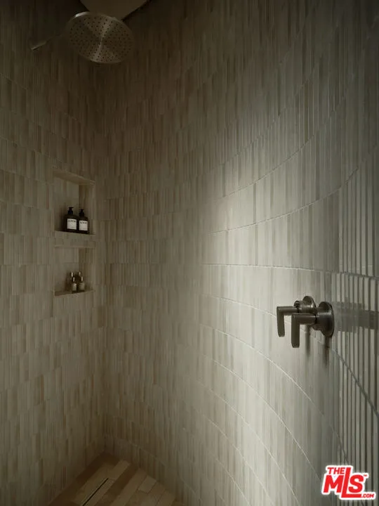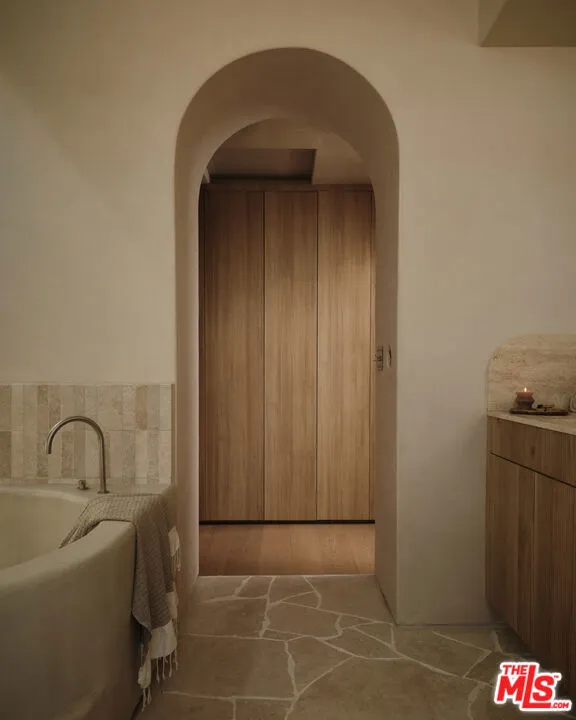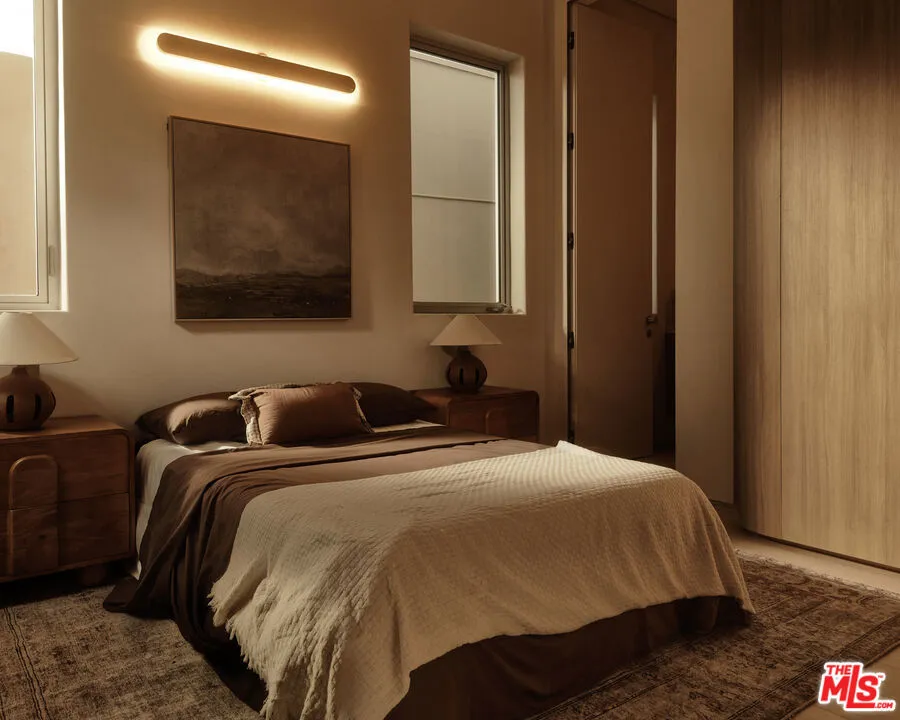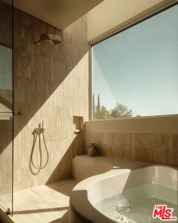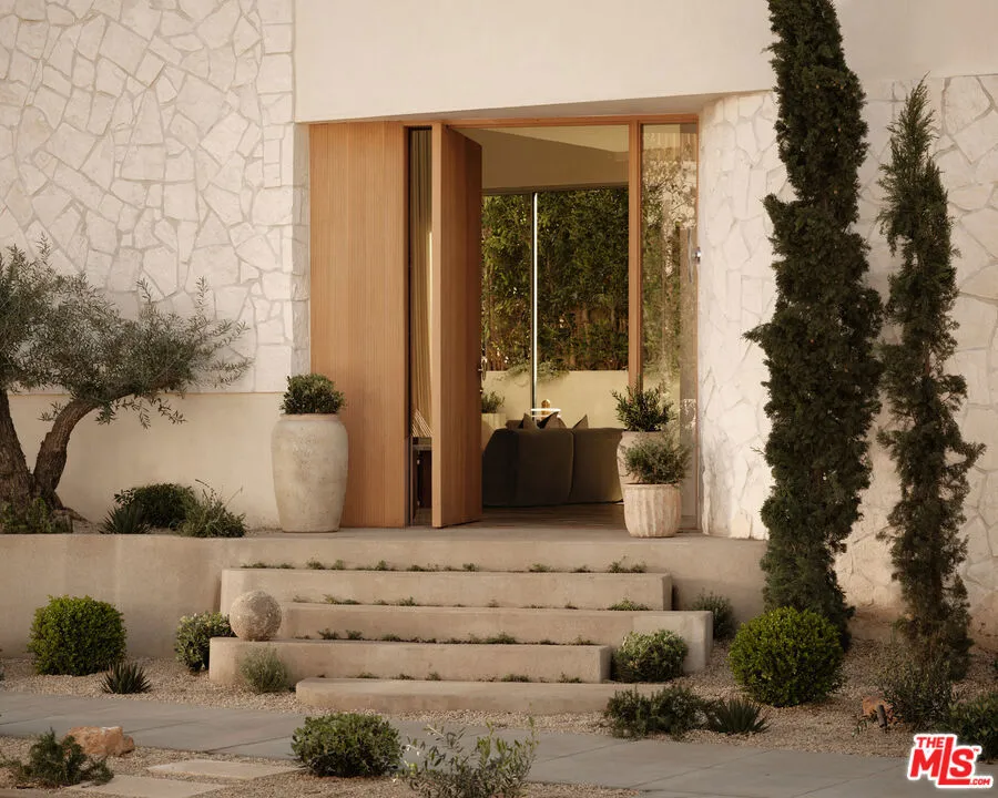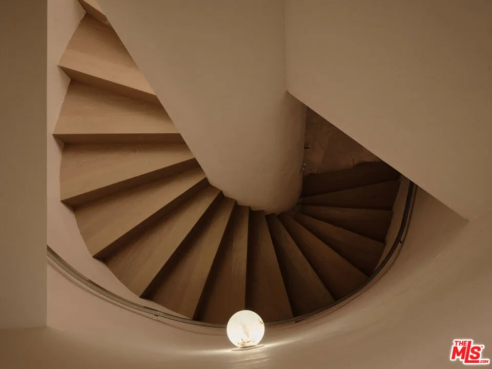 An architectural home defined by craftsmanship, materiality, and atmosphere in a highly coveted West Hollywood enclave. This 3 bedroom, 3.5 bath home balances flowing curves with luxurious interiors and a highly refined material palette. Travertine floors and surfaces, custom white oak cabinetry, and hand-applied plaster walls create depth and continuity throughout, while natural light moves seamlessly across the interiors, emphasizing texture, curvature, and proportion. Every element is intentional, prioritizing quality, restraint, and livability. The private rear yard is anchored by a 35-foot travertine-clad lap pool surrounded by greenery, offering a quiet retreat while also seamlessly integrating with the interior. Above, an expansive rooftop deck captures sweeping hills views; idyllic for entertaining and indoor/outdoor living. A rare architectural offering defined by atmosphere and enduring modernity.