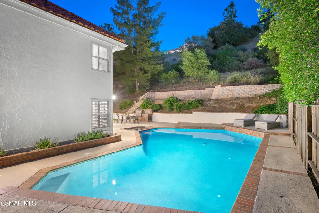 Private pool home in the desirable Southshore Hills community of Westlake Village. Ideally located across from a park, offering open views, added space, and a bright, airy setting. This beautifully refreshed 4-bedroom, 3-bath residence features new interior and exterior paint, newly painted kitchen cabinets, new light fixtures, new flooring throughout the downstairs, and recent roof updates.Abundant windows fill the home with natural light, enhancing its warm and inviting feel. The open-concept kitchen and family room offer direct access to the backyard and pool, creating seamless indoor-outdoor living. The thoughtful floor plan includes a bedroom and bath on the main level, ideal for guests or a home office. The dining room showcases striking beamed ceilings, while the living room is anchored by a classic brick fireplace. Upstairs, the spacious primary suite offers a private ensuite bath.The backyard is designed for effortless entertaining with a pool, multiple seating areas, and the added privacy of no neighbors directly behind. A spacious side yard provides additional areas to relax and enjoy.