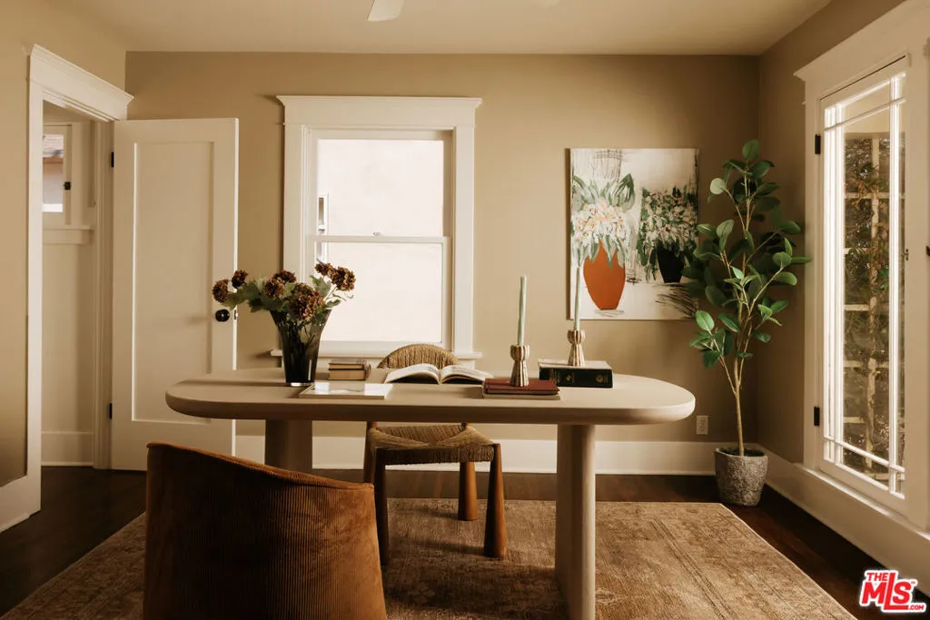 A thoughtfully restored Craftsman by Art Craft Homes in a great pocket of West Adams. A home that exemplifies the perfect balance of bright & fresh contemporary feel with historic preservation. The verdant front yard and wide porch are set behind an idyllic white picket fence. Inside, the open layout runs from the living room, which features a Batchelder-esque tile fireplace and built-ins, through to the dining area with decorative crown moldings, and into the kitchen. The kitchen includes glass-front cabinetry, wood countertops, a farmhouse sink, and a paneled dishwasher. The front bedroom, originally called a parlor room, makes for a great home office. The primary, with its vaulted ceiling, has a generous scale. Doors from both the kitchen and primary bedroom open to a spacious backyard with a deck, grassy area, and a double-bay garage with fantastic ADU potential. Be a part of the burgeoning West Adams neighborhood, and close to great new spots like Maydan Market, Highly Likely, and The Little Room.