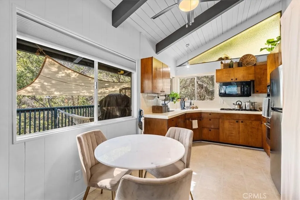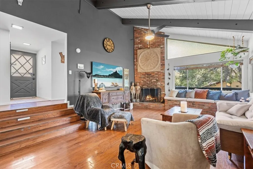 Charming and full of character, this 2-bedroom, 1.5-bath home offers a comfortable layout and a true mountain feel just minutes from Lake Gregory. Inside, you’ll find warm wood flooring and a spacious living room featuring high beamed ceilings, a brick fireplace, and built-in bench seating—creating a cozy yet open space that stands out. The living area flows into the kitchen and dining space, which opens directly to a large private deck, perfect for entertaining or relaxing outdoors. Recent updates include fresh interior paint and a new water heater, making the home move-in ready. The adjacent vacant lot provides added privacy and a more open, peaceful setting—a rare bonus for the area. One of the standout features of this home is the exceptional parking—something that’s hard to find on the mountain. Enjoy the convenience of being able to pull right up to the front door, making unloading groceries, luggage, or weekend gear quick and easy. Whether you’re looking for a full-time home, weekend escape, or investment opportunity, this property offers comfort, charm, convenience, and a prime location close to shopping, dining, and outdoor recreation at Lake Gregory.