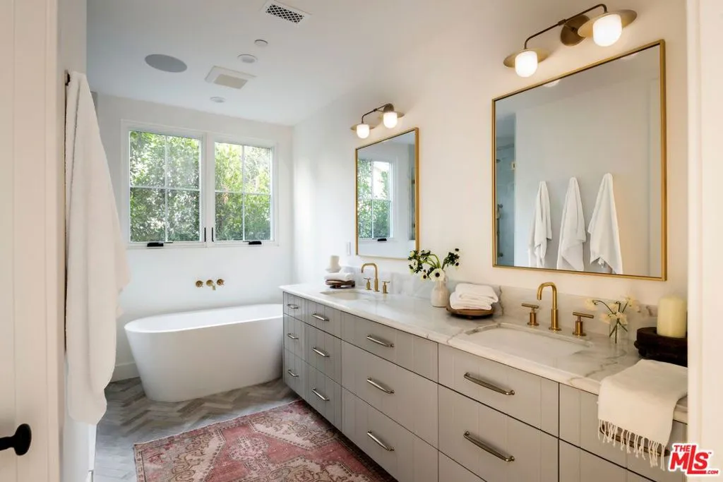 Built and designed by Bespoke Homes California, this Recrafted Residence features 4-bedrooms, 3.5-baths spanning 2,280 SF on a 5,399 SF lot with large oversized 2-car garage. A Recrafted Residence is a transformative, to-the-studs major remodel and addition, with almost all new components comparable to a new construction home. Pitched and vaulted ceilings, skylights, and expansive windows fill the interiors with natural light in this designer-done single story. Wide-plank engineered oak floors throughout lead to a living room centered around a stone fireplace with built-in cabinetry. The living room overlooks the true chef's kitchen, appointed with dual dishwashers, dual copper sinks, oversized Thermador refrigerator and freezer, custom cabinetry, and Michelangelo marble perimeter countertops. The striking soapstone island counter anchors the substantial eat-in bar. The kitchen connects seamlessly to the dining area featuring a built-in wet bar and wine refrigerator. Large sliding glass doors from the main living areas open to a turf yard, creating a natural flow between interior spaces and the outdoors. The tranquil primary suite offers a travertine fireplace, spa-like bath with soaking tub and tile and stone shower, and direct yard access. Each secondary bedroom en suite is curated with tile and stone selections. A private office with custom-built-ins and a Pinky's glass-and-iron door provides flexibility for work or creative pursuits. Smart home technology, a laundry room, oversized garage and a charming front porch overlooking a grassy, fenced front yard complete this contemporary retreat. An exceptional expression of single-level living, ideally located in prime Mar Vista near the beach, and moments from neighborhood coffee shops, dining, and the vibrant Venice Boulevard corridor.