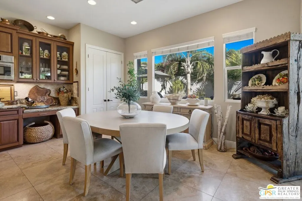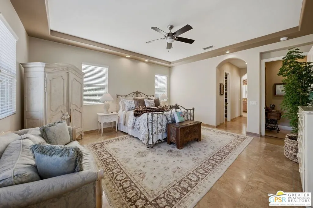 This spectacular executive residence is located within the prestigious gated enclave of Brenna at Capri and is sure to impress the most discerning person. Offered fully furnished with high-end designer pieces, this exceptional property sits on an expansive quarter-acre lot, showcasing a lushly landscaped backyard oasis with a private in-ground pool and spa in your own serene desert retreat. A covered patio perfectly captures the essence of indoor-outdoor living, ideal for entertaining or relaxing under the desert sky. Spanning over 3,200 square feet, the home features four generously sized bedrooms and four well-appointed baths. A welcoming foyer opens to a grand living space and an open-concept layout designed for both comfort and sophistication. The chef's kitchen is a true centerpiece, complete with granite countertops, a spacious sit-at island, breakfast nook, and premium appliances perfect for culinary enthusiasts. The primary suite is a luxurious sanctuary, offering a spa-inspired bath with a soaking jacuzzi tub, custom stone shower, dual vanities, and a large walk-in closet. Each additional bedroom is equally spacious and thoughtfully designed. A private detached casita off the courtyard provides an ideal space for guests, featuring its own bedroom and sitting area, closet, and bath. A two car garage with ample storage, and with direct access into the main house completes the package. Conveniently located near parks, top-rated schools, shopping, and I-10 Freeway access, this home seamlessly blends luxury, comfort, and prime location.