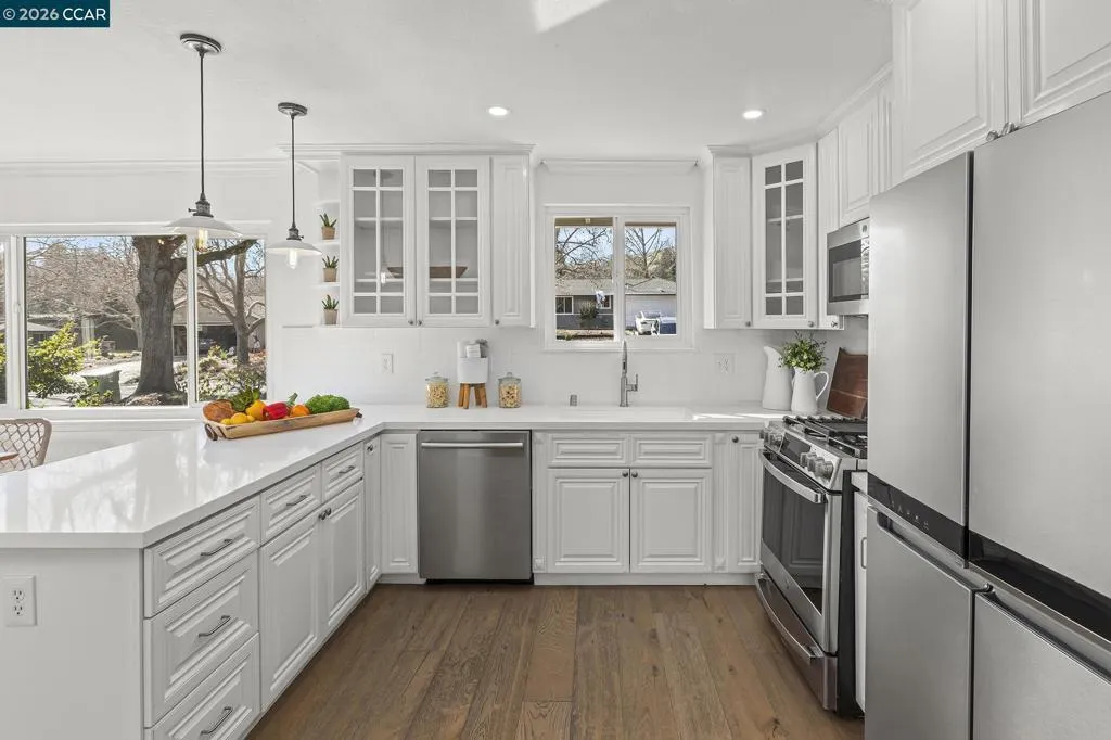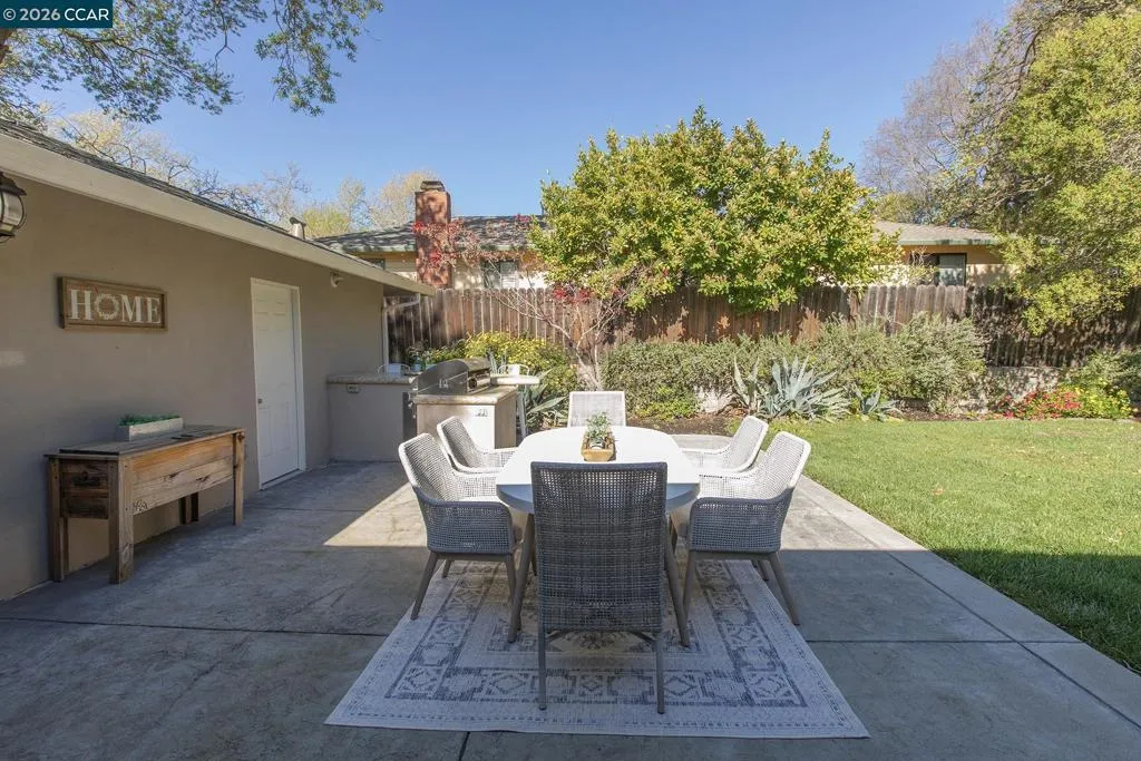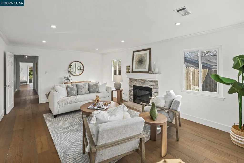 Just steps from the popular Lafayette/Moraga Trail, this updated single-story home with a flexible floor plan is an ideal blend of charm and modern convenience. The interior features three bedrooms, plus a flexible bonus room that is an ideal media room, home office, or fourth bedroom, two bathrooms, and stylish, wide-plank oak hardwood floors throughout. The kitchen serves as the heart of this residence, showcasing sleek quartz countertops and stainless steel appliances while flowing effortlessly into the dining area and outdoor space. Natural light pours into the living room through expansive windows, where a cozy fireplace acts as a central focal point. In the primary suite, comfort meets luxury. This true retreat includes double closets, a spa-inspired ensuite bathroom with a twin vanity and oversized shower, and a door leading directly to the backyard patio and hot tub. The exterior is a year-round haven featuring a level lawn, vibrant gardens, a built-in BBQ, and two separate patios perfect for gatherings. Situated in popular Lafayette Estates, the home is surrounded by peaceful, tree-lined streets and is just minutes from the Lafayette Community Center, Community Park, and top rated Burton Valley Elementary.
