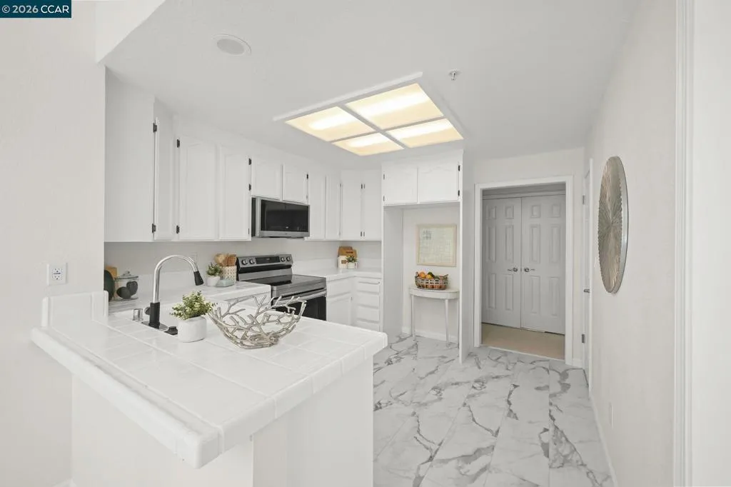 Rarely available and highly sought-after Rosslyn Model in Rossmoor Greens, one of the newer 'neighborhoods' in the community. This beautifully updated 2BD/2BA + office condo offers elegant, light-filled living in the heart of Rossmoor's premier 55+ community. The seamless floorplan features an oversized primary suite with walk-in closet, eat-in kitchen, cozy fireplace, inside laundry, and a generous balcony with stunning hillside and sunset views. Move-in ready with fresh paint, new carpet, luxury LVP flooring, updated vanities, and modern fixtures throughout — plus a detached garage and just 2 gentle steps to the front door. Beyond your front door, enjoy resort-style amenities including pools, golf, fitness center, movie theater, on-site restaurant, shuttle service, clubs, and so much more. This is the 55+ active adult lifestyle you've been waiting for!