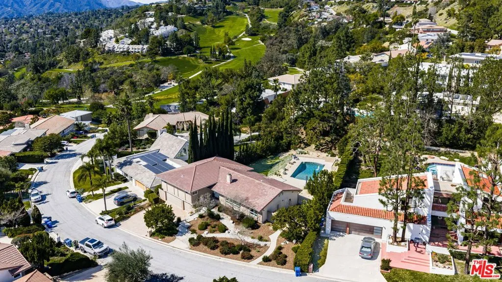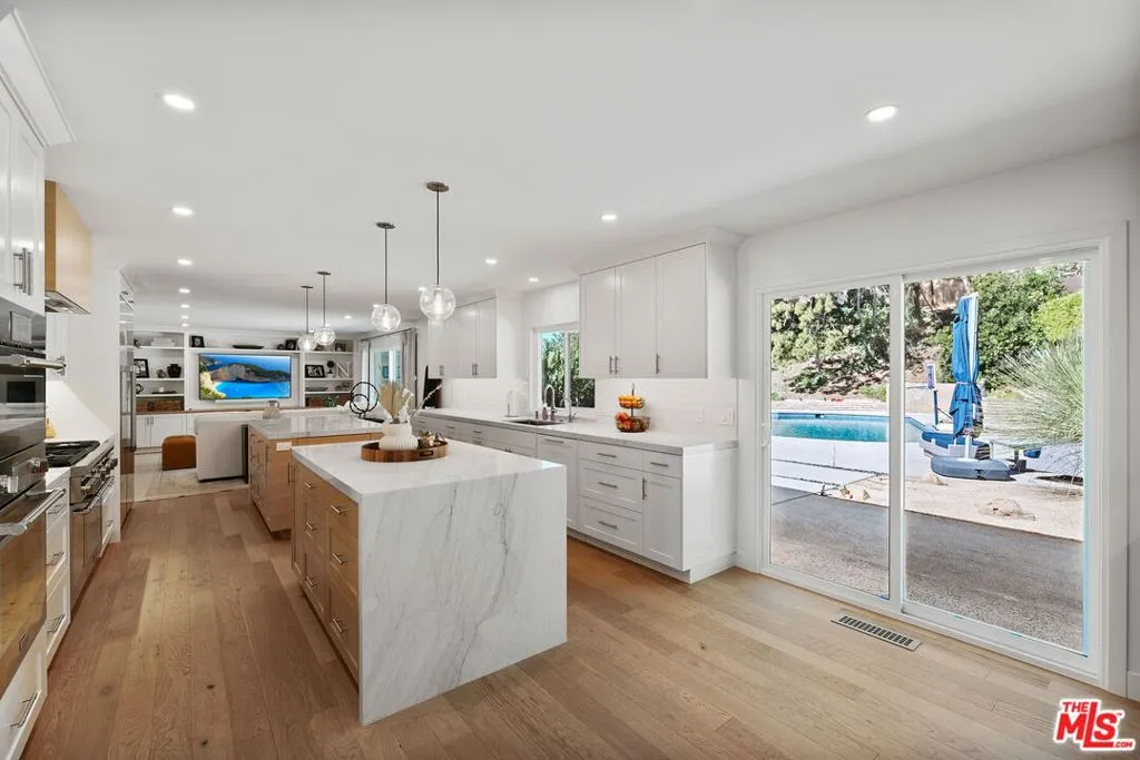 Indulge in the pinnacle of contemporary luxury in this extensively remodeled (2023) home, where architectural character meets state-of-the-art refinement. Defined by a spectacular floor plan that maximizes both scale and flow, the home is bathed in great natural light throughout. The residence begins with a breathtaking formal living room featuring vaulted beamed ceilings and a stately fireplace, offering a sophisticated space for hosting. The heart of the home is a chef's dream kitchen and adjacent family room, creating an expansive open-concept living area. This culinary masterpiece features professional Thermador appliances, dual oversized islands, and custom finishes that flow effortlessly into the family room, which is adorned with brand-new custom built-ins. Designed for modern living, the layout is as functional as it is elegant, featuring four generously sized bedrooms conveniently located all on the upper level. The primary suite serves as a private sanctuary, complete with a walk-in closet and a balcony overlooking the grounds. On the lower level, versatility takes center stage with a spacious bonus room, perfect for movie night, a dedicated office boasting a built-in desk and custom cabinetry as well as a bathroom and laundry room. High-end engineered wood flooring and designer recessed lighting run through every room, while all-new windows and sliding glass doors offer a constant connection to the outdoors. Practicality is woven into the luxury with an upgraded electrical panel, a tankless water heater, and a spacious three-car garage complemented by a large, elegant paver driveway. The exterior is a masterclass in the California lifestyle, centered around a sparkling Pebble Tec pool with brand-new equipment and a sprawling patio perfect for al fresco entertaining. Professionally curated drought-tolerant landscaping provides a lush yet sustainable complement to the expansive grassy areas. From the refined infrastructure to the high-end aesthetic details, every element of this residence has been meticulously reimagined to offer an unparalleled turn-key experience for the most discerning buyer.