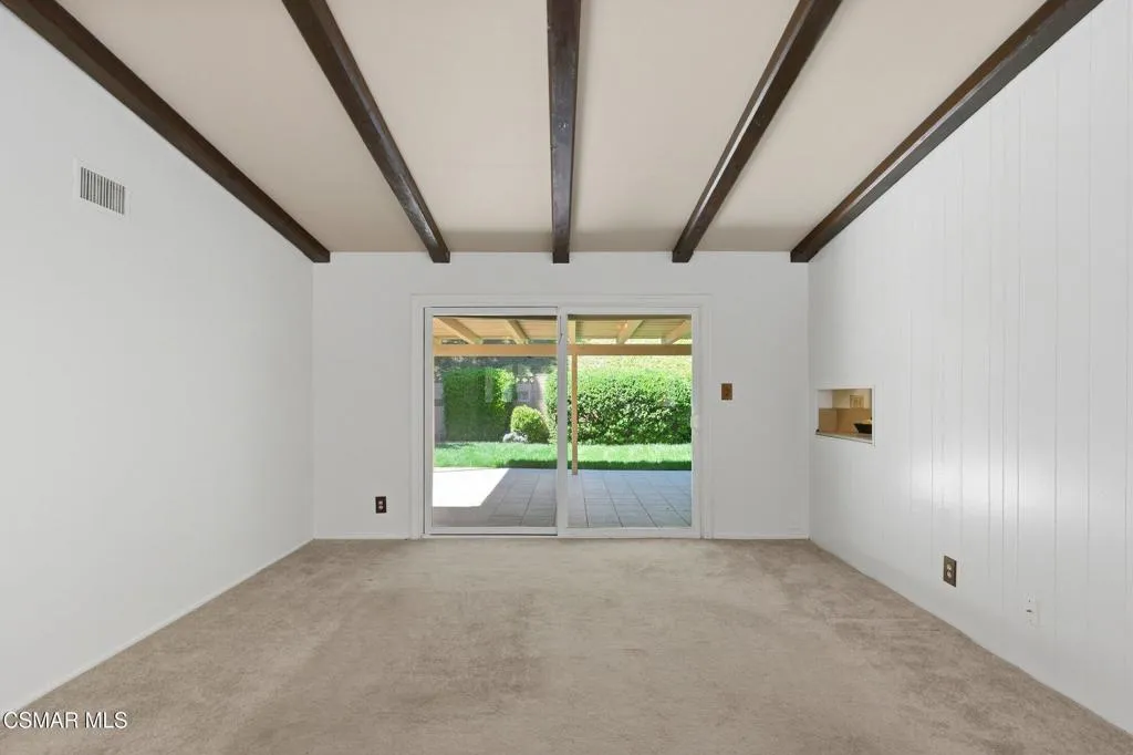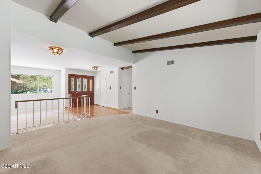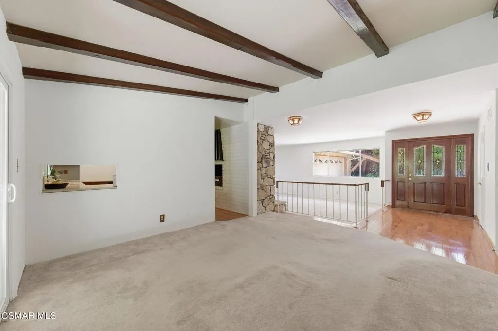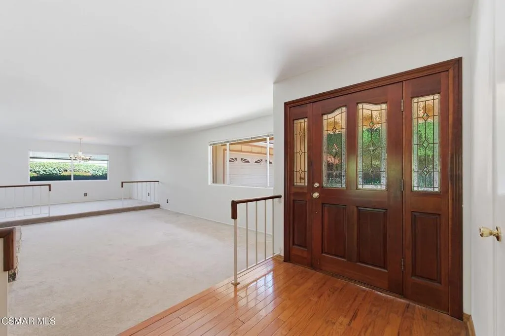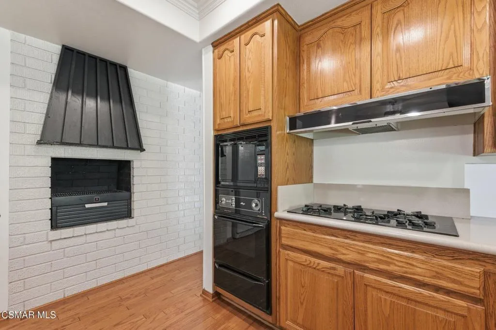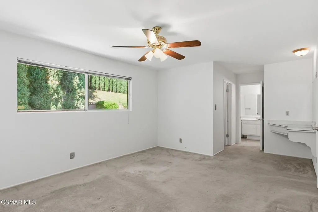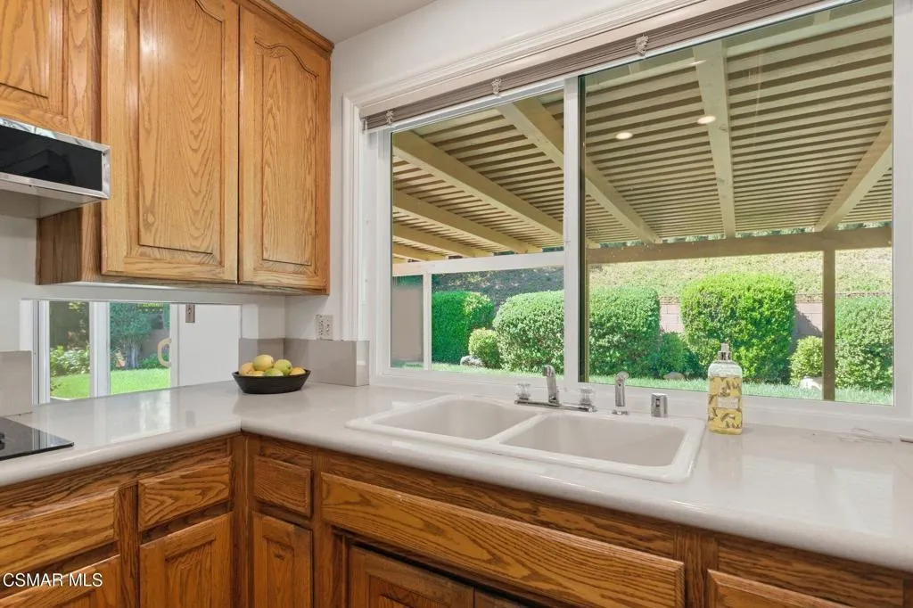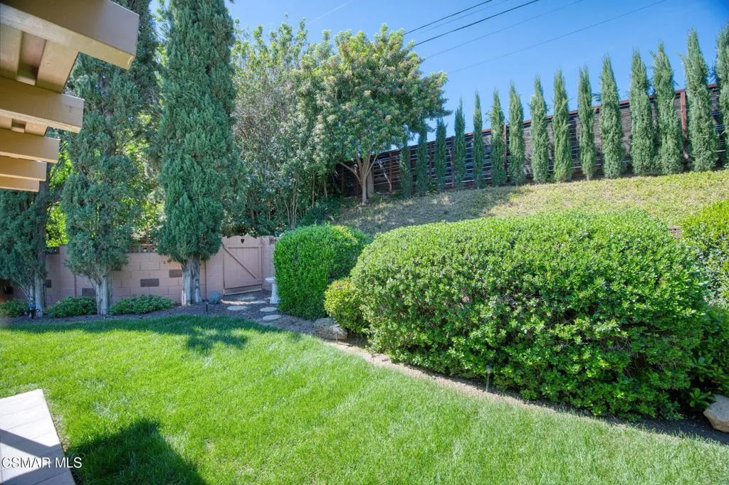 Meticulously maintained & freshly painted throughout, this single-story 3 bedroom, 2.5 bath Thousand Oaks home offers an exceptional opportunity! Spanning nearly 2,000 square feet on a serene & private 10,454 square foot lot, it is ideally situated within one of the area's most sought-after neighborhoods. Newer paver-stone hardscape driveway & drought-tolerant landscaping create an elegant curb appeal with minimal maintenance. 2 car garage with side yard access offers extra storage options and garage fridge. Inside, freshly painted neutral interiors are complimented by rich wood flooring & an abundance of natural light. Custom sidelight entry doors open to a spacious living room highlighted by a dramatic floor-to-ceiling stone fireplace, seamlessly flowing into the dining area with chandelier. An adjacent family room/den/study enhances the open feel with newer sliding doors that invite the outside in & provide direct access to the lush backyard & fully covered patio. The kitchen features updated countertops, a breakfast bar, dual-pane windows & sliders, a built-in desk area, space for casual dining & a unique indoor barbecue--perfect for effortless everyday living & entertaining. Great floorplan includes 3 light-filled bedrooms, each with ceiling fans. The Primary suite has a dressing table, walk-in closet, ceiling fan & views of the rear yard & hillside with Italian cypress trees at the rear of the property. The serene backyard is enclosed by block walls with gates for added privacy. The covered patio is deal for year-round enjoyment & yard has lemon trees, flowering plants, hillside ground cover, Italian cypress trees & a stunning juniper tree in the front yard. Additional upgrades include a newer roof, updated HVAC system, convenient indoor laundry, 2 full baths plus a powder room ideally positioned for guests. With a prime location near shopping, dining, healthcare, scenic hiking trails, botanical gardens, & top-rated schools, this home offers the perfect blend of comfort, style, & convenience with no HOA in the heart of Thousand Oaks.