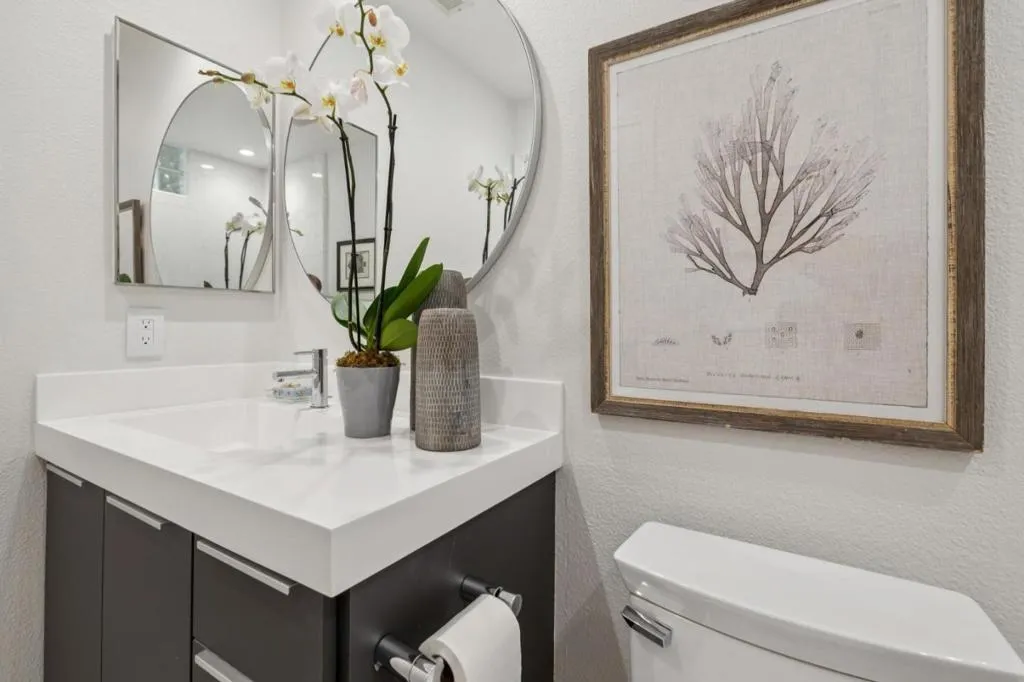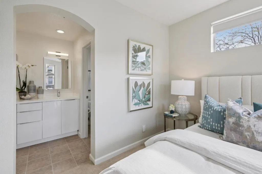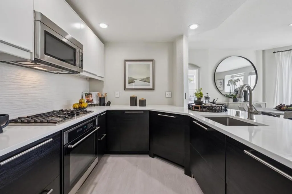 Updated modern condominium in Ventana del Mar on Redwood Shores Lagoon. Featuring a sought-after split-bedroom floor plan, this unit with two bedrooms and bathrooms centers on an open-concept living space. The open living and dining areas enjoy the warmth of a cozy fireplace and cool breeze from the balcony. The streamlined kitchen, boasting chic cabinets, quartz counters, and stainless steel appliances, overlooks the living space via a dining counter, perfect for entertaining. The primary suite offers a serene retreat with an array of windows and reading nook, a modern bathroom with double-sink vanity, and a walk-in closet with Elfa storage. A second bedroom with an adjacent bath, plus in-home laundry, adds ultimate convenience. Residents enjoy resort-style amenities, including a waterside pool, spa, fitness center, clubhouse and access to shoreline walking paths. Come live the dream!