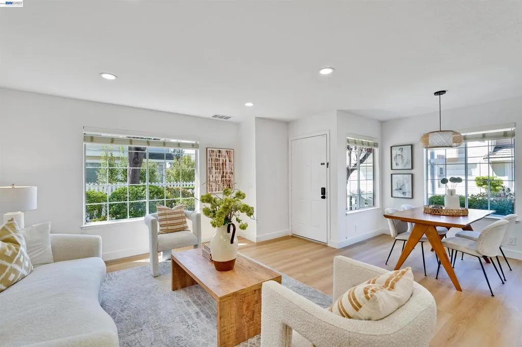 Experience modern living in this gorgeous, move-in-ready two-story corner townhouse. Bathed in natural light, the home features a open floor plan and a bright living room perfect for relaxing. The kitchen has been beautifully upgraded with premium countertops and recessed lighting, all complemented by fresh interior paint and high-quality hardwood floors throughout. The expansive primary suite serves as a true sanctuary, featuring a walk-in closet and plenty of space for a nursery, home office, or fitness studio. Upstairs, a hallway skylight ensures the home feels airy and vibrant year-round. Outside, you'll find a charming front yard filled with lush flowers and plants, plus the added convenience of a side-by-side two-car garage. Ideally situated within walking distance to the distinguished Forest Park Elementary and Fisher Park, this home offers an unbeatable commute near I-880, Hwy 84, Meta HQ, and Google shuttle stops. Enjoy a low-maintenance lifestyle with an HOA that covers your roof ,water, hazard insurance, and exterior maintenance.