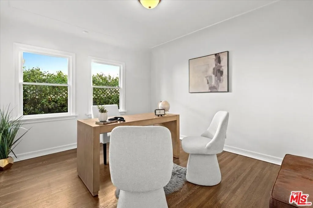 Charming English Tudor Revival on tree-lined Sierra Bonita in Wilshire Vista/Miracle Mile. This meticulously updated home blends historic character with extensive modern upgrades, including a fully built guest house. Set behind native landscaping, the property features a steep gabled roofline, turret, and original stained glass window. A double driveway leads to a private gated courtyard. Inside, the home showcases restored crown moulding, barreled ceilings, refinished hardwood floors, custom built-ins, and original crown glass windows. Formal dining room with arched ceilings flows into a chef's kitchen with custom cabinetry, Caesarstone counters, sealed Roca tile, and Fisher & Paykel, Wolf, and Bosch appliances. Breakfast nook and adjacent laundry room with LG washer/dryer. Primary suite includes custom closet and French doors to a rebuilt deck. Primary bath features herringbone tile, freestanding tub, and walk-in shower. Private backyard offers mature landscaping with citrus trees, jasmine, trumpet vines, and a vine-covered pergola. Converted garage functions as a guest casita with kitchen, built-ins, exposed beams, and full bath. Major upgrades: new 200-amp electrical panel with surge protection, upgraded grounding (main + guest house), high-efficiency Carrier Infinity HVAC with new ductwork, tankless water heater, seismic retrofit, structural repairs, attic insulation with radiant barrier, sump pump, foundation waterproofing, and French drains. Additional improvements include rebuilt fireplace, fresh interior paint, renovated closets, new ventilation, reverse osmosis system, updated guest house bath, recessed lighting, landscaping, security lighting, and termite treatment. Smart features: HVAC thermostat, tankless water heater, Moen Flo system, irrigation, smart locks, ADT security, and Nest cameras. Moments from Sonoratown, Dam Good Coffee, Bloom, LACMA, The Grove, and the 10 freeway.