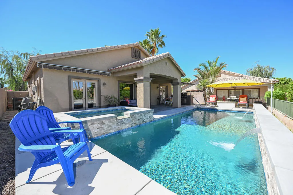 Enjoy the desert life in this beautifully designer-furnished vacation retreat featuring two private primary suites, each with French doors opening to a resort-style backyard with a custom pool and spa.The upgraded kitchen showcases granite countertops, abundant cabinetry and prep space, a sunny breakfast nook, breakfast bar seating, recessed lighting, crown molding, and a convenient pantry located off the laundry room.The open great room is designed for comfortable living and entertaining, offering a spacious dining area, gas fireplace with custom mantel and tile surround, built-in media center with speakers, and French doors that create seamless indoor-outdoor flow. The garage is equally well-appointed with an epoxy floor, built-in workbench, and its own A/C.Step outside to an exceptional outdoor living space perfect for entertaining, complete with a stunning custom pool and spa, covered patio, motorized awnings, fire feature, built-in BBQ, expanded concrete decking, and extensive landscape lighting -- all overlooking a picturesque golf course view.Just bring your swim trunks, golf clubs, and sunscreen and start enjoying the desert lifestyle. Rental includes a utility allowance, DirecTV, Wi-Fi internet, and access to two community pools, spas, and fitness centers. Ideally located near La Quinta, Palm Desert, PGA West, and the Indian Wells Tennis Garden.Jan-Feb-Mar $6,000 | April $7,000 | Nov-Dec-May $4,500 | June through October $3,900 | Annual Lease available for $4,200Inquire for more details, deposits and fees. Small dog with approval and additional fee. No cats. Home furnishings, rates, and availability are subject to change.
