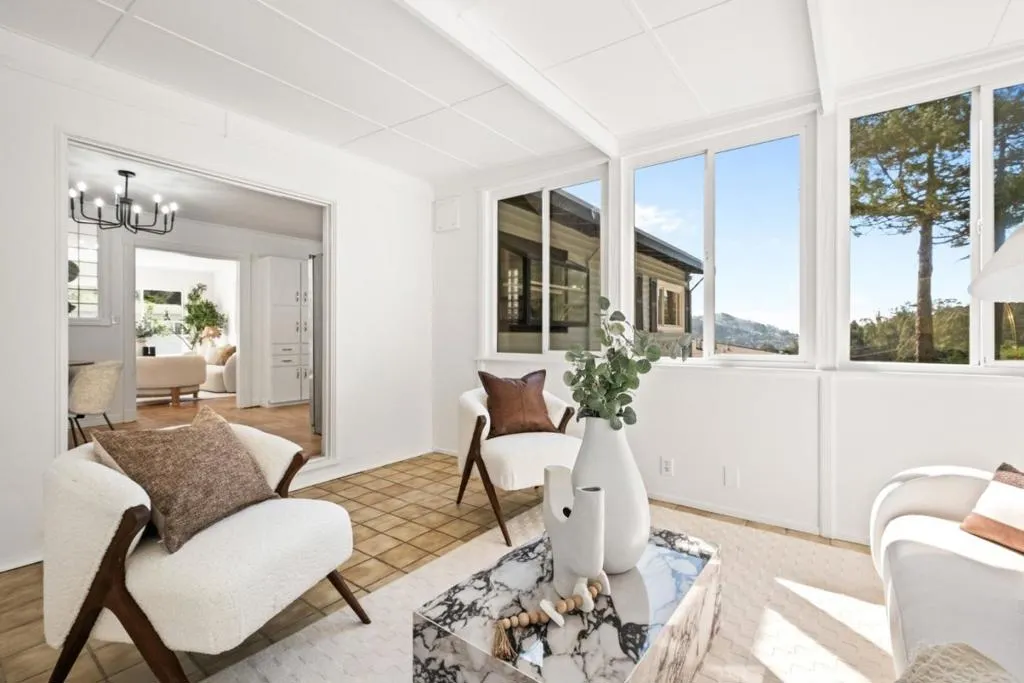 Set in Pacificas scenic coastal hills, 1135 Valencia Way blends natural beauty w/comfortable, light-filled living. This 3-bedroom, 2.5-bath home offers approximately 1,649 sq ft (buyer to verify), with all main living areas on a single level. Inviting curb appeal and surrounding greenery create a sense of privacy and calm. Inside, large picture windows frame hillside views and fill the home with natural light. The living room, anchored by a classic brick fireplace, offers a warm space to gather. The bright kitchen features crisp cabinetry, stainless steel appliances, and a window overlooking the trees. A sunroom extends the living space, ideal for relaxing year-round. Bedrooms are filled with natural light, offering flexibility for guests or a home office. Downstairs, a 367 sq ft recreational room provides bonus space for a gym, media room, or workspace. Surrounded by nature yet just minutes from Pacificas beaches, trails, & local amenities, this home offers a rare combination of privacy, versatility, & coastal lifestyle.