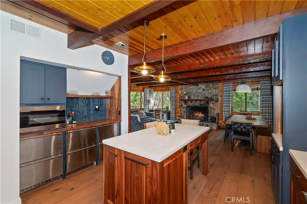 Rustic character meets modern polish in this beautifully updated Lake Arrowhead home with full lake rights. Set directly across from the Lake Arrowhead Country Club and minutes from National Forest trails, this property puts boating, fishing, swimming, hiking, and easy commuter access all within reach. The main level welcomes you with an open layout anchored by a striking stone fireplace in the living room, flowing into a generous dining area built for gathering. The upgraded kitchen pairs high-end appliances with smart design—equally suited to weeknight dinners and weekend entertaining. A well-appointed, main-level bedroom and full bath round out this floor with added flexibility for guests. Upstairs, the primary suite is a genuine retreat: vaulted beamed ceilings, a second stone fireplace, a sitting area, and a private deck overlooking the mountain air. A second bedroom and impeccably finished bathroom share this level with the primary bedroom. Downstairs, the finished lower level is an entertainer’s dream. Wraparound couches, custom artwork, and tasteful décor create a lounge-ready atmosphere, while a mounted 72-inch television with state-of-the-art surround sound turns movie nights and game days into an experience. It’s the kind of space guests never want to leave. Practical details haven’t been overlooked —a two-car garage, ample guest parking, air conditioning, and a tankless water heater keep the home running efficiently year-round. Tastefully maintained and thoughtfully upgraded, this is Lake Arrowhead living at its best—lake privileges and furnishings included and the memories are yours to make.