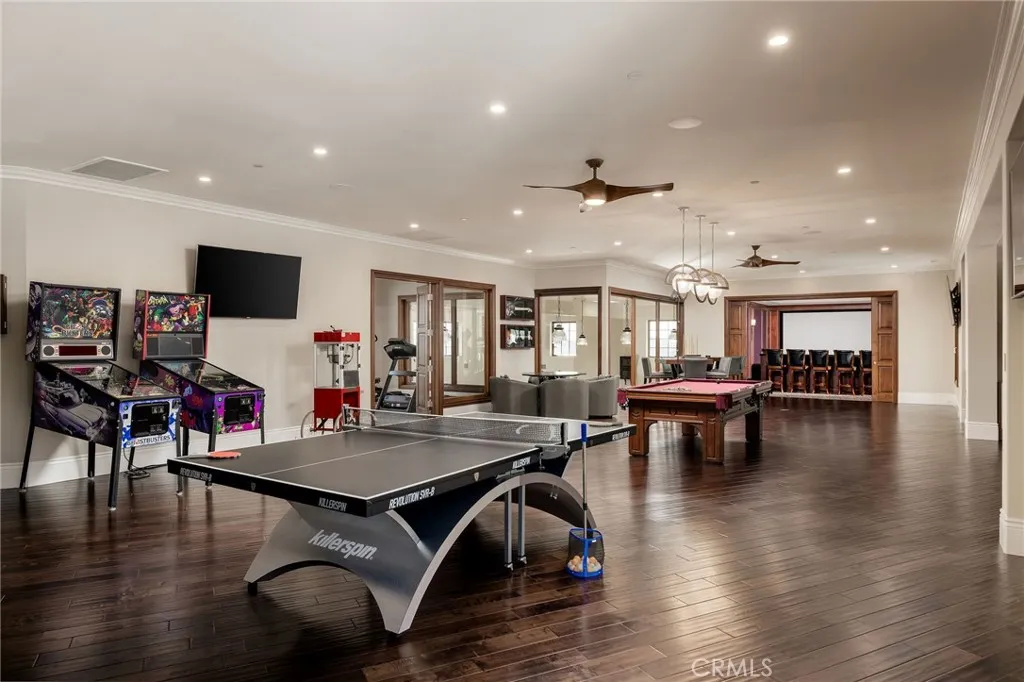 Set within the prestigious Los Ranchos Estates on nearly six acres, this remarkable private compound was thoughtfully designed as the ultimate setting for gathering, recreation, and everyday living on a grand scale. Surrounded by open space and capturing sweeping views across Coto Valley, the property offers an extraordinary level of privacy while delivering resort-level amenities rarely found in a single residence. Completed in 2017, the residence features five spacious bedroom suites, each with its own en-suite bathroom and private balcony or loggia, along with nine bathrooms total, including four powder rooms. Additional spaces include two private offices and a large playroom that could easily convert to an additional bedroom or creative space. At the heart of the home is a chef’s kitchen designed for both everyday living and entertaining, featuring a La Cornue Grand Palais range, Woodstone pizza oven, built-in coffee system, wine dispenser, and extensive custom cabinetry throughout. Designed to bring people together, the estate offers an unparalleled collection of amenities including a private theater with an adjoining bar and lounge, two Brunswick bowling lanes, a large indoor maple wood half-regulation basketball court, professional batting cage, gym, and temperature-controlled wine room. The fully fenced and gated grounds include a tennis court, outdoor fireplace, two fire pits, sound throughout the exterior grounds, multiple terraces and balconies, and a private quarter-mile walking path surrounding the property. Additional highlights include an eight-car garage, elevator, Savant whole-house audio system, Lutron lighting, Bieber windows and doors throughout, and two dedicated server rooms. The original building pad was raised five feet to maximize the sweeping views across Coto Valley. A rare opportunity to own a truly one-of-a-kind private estate designed for both exceptional entertaining and everyday enjoyment.