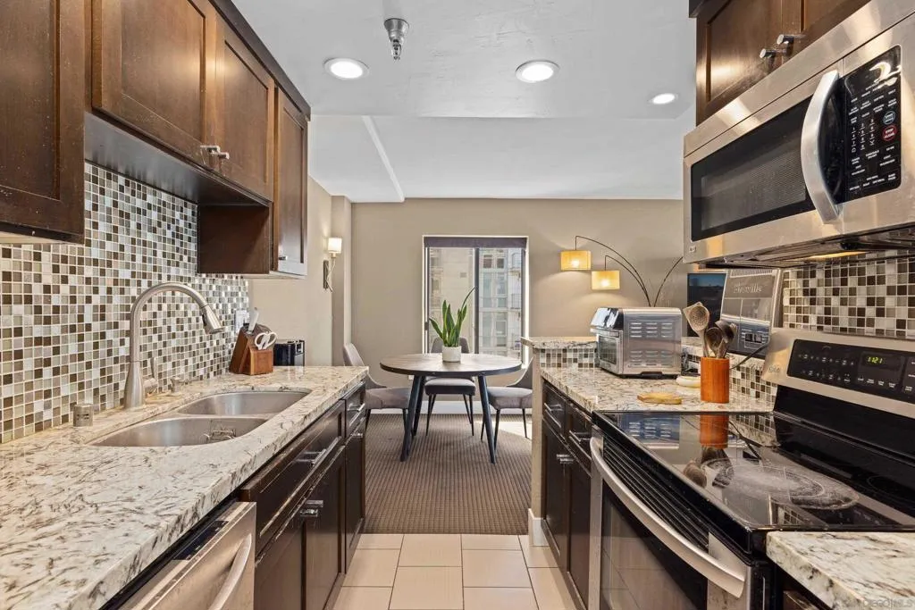 Welcome to Symphony Terrace in the highly desirable Cortez Hill neighborhood of downtown San Diego. This beautifully remodeled southwest corner residence offers abundant natural light, refreshing cross breezes, and sweeping city views from the living room, private balcony, and both bedrooms. Thoughtfully updated throughout, the home features an open-concept layout with upgraded flooring, baseboards, and modern finishes. Continued in Supplement below... The renovated kitchen is designed for both style and functionality, showcasing granite countertops, stainless steel appliances, recessed lighting, and custom cabinetry with soft-close doors and drawers. Both bathrooms have been tastefully remodeled with updated cabinetry, countertops, and fixtures. The spacious primary suite includes a walk-in closet and a sleek walk-in shower. Additional highlights include in-unit laundry, two tandem underground parking spaces, and a private storage locker—offering both convenience and value. Symphony Terrace is a well-maintained community offering resort-style amenities, including a pool, spa, fitness center, sauna, steam room, bike storage, guest suite, and poolside barbecue area. Ideally located with easy access to Interstate 5 and Highway 163, Cortez Hill provides a peaceful residential setting just moments from the vibrant energy of Little Italy, the Gaslamp Quarter, and Balboa Park. This is an exceptional opportunity to own a move-in ready residence in one of downtown’s most charming and convenient neighborhoods.