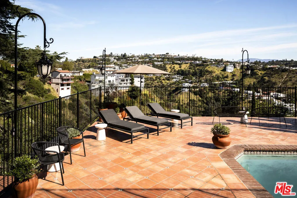 This nearly 4,000-square-foot Hollywood Hills retreat sits just above the Chateau Marmont with sweeping downtown skyline views from the front and expansive canyon views from the back. Tucked away on a quiet cul-de-sac just a three-minute drive to the Sunset Strip, the home offers rare privacy, all-day sunlight, a large pool, and an expansive entertaining deck - highly unusual at this price point. Completely redone through a multi-million-dollar designer renovation, the interiors feature Italian terrazzo, Kelly Wearstler tile and lighting, a lacquered Aran Cucine kitchen crafted in Italy with Miele appliances, Ann Sacks tile, and Nero Marquina marble countertops from Spain. Additional upgrades include custom cabinetry throughout, multi-function smart toilets with bidets, solid wood interior doors, and a custom walk-in closet in the primary suite. The light-filled main house features soaring ceilings, three huge bedrooms and two and a half baths, a grand eat-in kitchen with island, a spacious den/TV room, and a striking living room - both with fireplaces and commanding views - along with a formal dining room overlooking city lights. A completely private ADU, currently configured as an office and gym, includes a remodeled kitchenette, bath with steam shower, hardwood floors, and a wraparound deck with canyon views. It has previously generated rental income. Beautifully landscaped and professionally lit, the property also features an upgraded electrical panel supporting two EV fast chargers in the two-car garage. Located in an area experiencing significant investment - with several recent sales over $20M and multiple large-scale projects underway - this is a rare opportunity to own a fully renovated home on one of the Hills' quietest streets, known for some of the most spectacular views in the city. A turnkey offering with huge views, chic interiors, and significant upside potential.