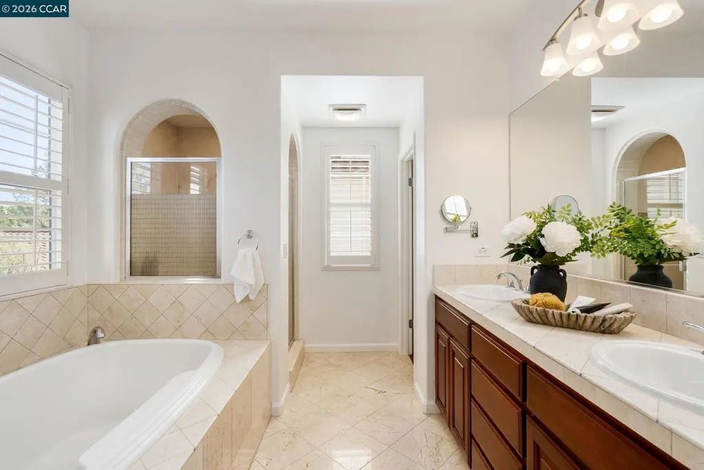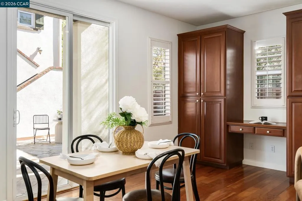 Beautifully updated Mediterranean-style home in sought-after Gale Ranch on a premium corner lot! 5 bed, 4 bath, 3,177 sqft. This bright, spacious home features rich hardwood floors, plantation shutters, and recessed LED lights throughout. The open floor plan offers surround sound, and abundant natural light. Gourmet kitchen with granite countertops, full slab backsplash, Whirlpool stainless steel appliances, gas cooktop, refrigerator, built-in reading nook, ample cabinet space, and large center island with breakfast bar opening to the family room with built-in media center. First floor includes formal dining, living room with fireplace, full bedroom and bath, and large storage room. Upstairs features a luxurious primary suite with dual sinks, soaking tub, glass shower, and custom walk-in closet, plus a den with built-in desk and cabinetry. Detached in-law unit (+/ -320+ sq ft) with private entry above garage, ideal for guests or rental. Lush backyard with patio and low-maintenance landscaping, perfect for entertaining. Paid off Solar system, Water Softener. 2-car garage plus carport (3 parking spaces total). Close proximity to top rated schools, Bishop Ranch, shopping, dining, parks, walking trails, access to I-680. Truly a must-see!