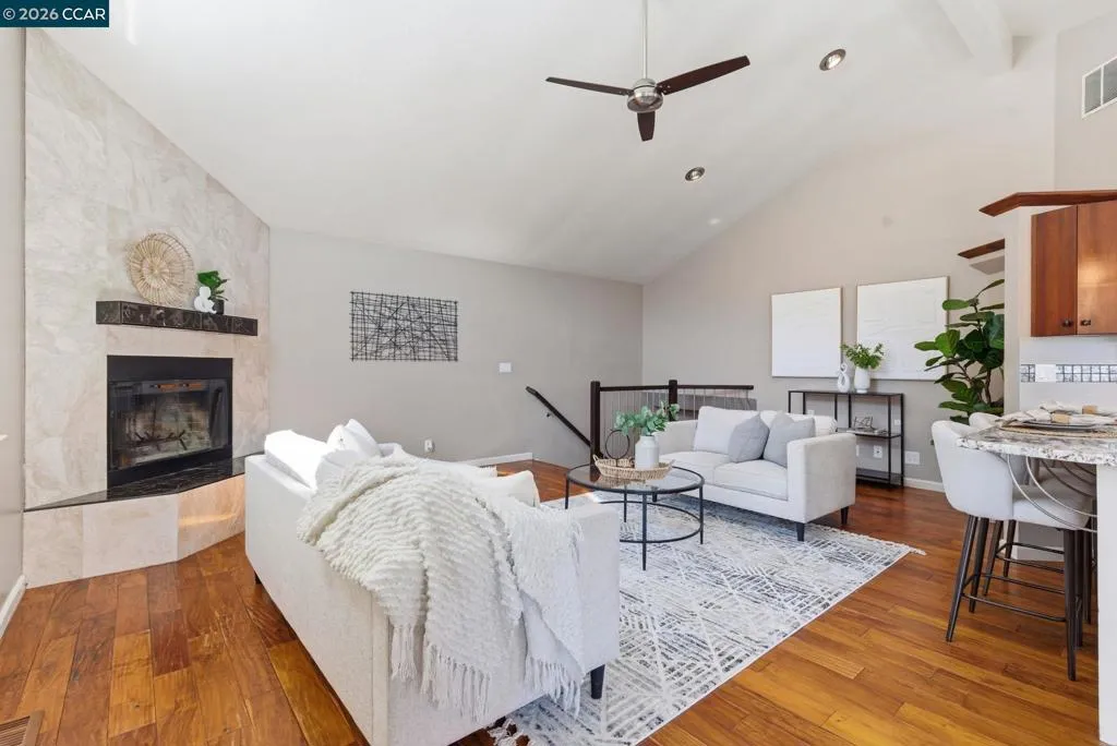 Beautifully updated, turn-key contemporary home in the desirable unincorporated Mountain View neighborhood of Martinez! This light-filled residence features soaring vaulted ceilings, a dramatic floor-to-ceiling marble fireplace, & an open-concept layout ideal for modern living. The custom kitchen showcases rich cherry cabinetry, upgraded granite countertops, durable porcelain flooring, S.S. Frigidaire appliances, & a breakfast bar that opens effortlessly to the main living spaces. Elegant cherry wood flooring runs throughout, complemented by modern stair railings with brushed nickel accents, while the bedrooms offer plush carpeting for comfort. The spacious primary suite features dual sinks & abundant natural light from skylights & sun tunnels. Recent upgrades include a new furnace, new A/C condenser, newer roof, tankless water heater, & Nest thermostat - offering comfort, efficiency, & peace of mind. The finished 2-car garage includes a 220V outlet. Step outside to your private, fenced backyard with lawn & covered patio—perfect for relaxing, pets, children or entertaining! Ideally located near Morello Park Elementary, Hidden Valley Park, & Briones Regional Park, with convenient access to Highways 4 & 680. Enjoy the perfect blend of peaceful hillside living & everday convenience!
