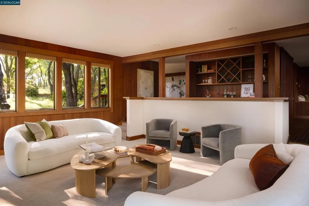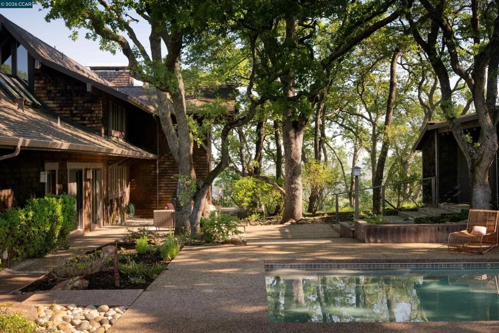 An architectural landmark in Alamo designed by renowned architect Henrik Bull. Double lot! Four bedrooms + office. Set in a rare, predominantly flat hilltop setting, this property offers the uncommon combination of expansive level land, views, and a quiet, walkable neighborhood. Bull’s signature design is on full display with soaring peaked ceilings, exposed beams, walls of glass, and redwood, creating a home that is both dramatic and deeply livable. 2 full + 2 half baths in home, full bath in pool house. In 16 years, one of my favorite properties! Friendly street, lovely light, a great double lot! More photos on the way. Open Sat / Sun 1-4pm