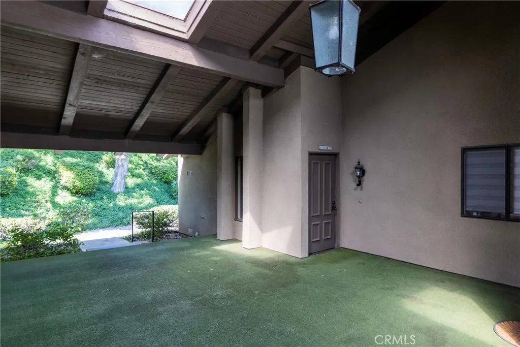 Great location within the popular Landmark+55 retirement community! What makes this location so ideal is the easy access from the garages and the privacy of being in the back of the building next to a large sloped green belt area directly behind the home. Therefore, it is a very quiet location. It is an upper unit but it is ground level with the back of the unit, including a nice patio area that is part of the property. Another important feature is this unit has two garages where typically most units in Landmark only have one garage. This section of Landmark was built in 1981 and has gas connections unlike the units that were built in 1975. The entry has vaulted ceilings with recessed lighting and skylight, creating a nice spacious living room area. The covered patio extends off the living room and is a very private area that enjoys views of the greenbelt. The kitchen and bathrooms have been beautifully updated and both bathrooms have skylights. The primary suite also has two closets. The tile floors in the living room, kitchen and hallway are a special tile designed to not get too hot or cold. Refrigerator, washer and dryer are included in the sale. Landmark is a special community offering a variety of amenities starting with 24/7 guarded security. The large clubhouse offers a variety of different events and activities, supplemented by tennis courts, large pool/spa area, pickleball court, putting green, fitness center, library, etc. Also directly across from La Mirada Golf course and Regional Park.