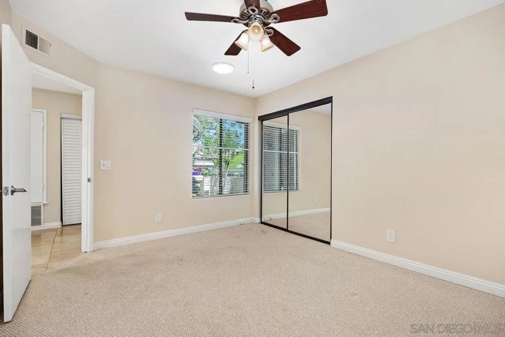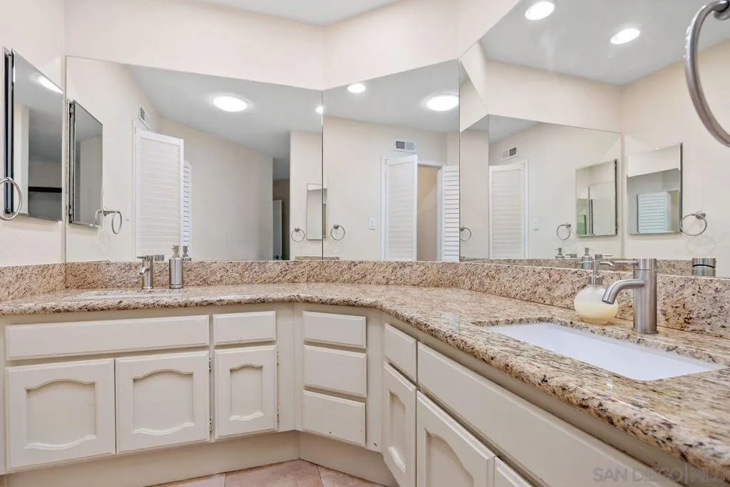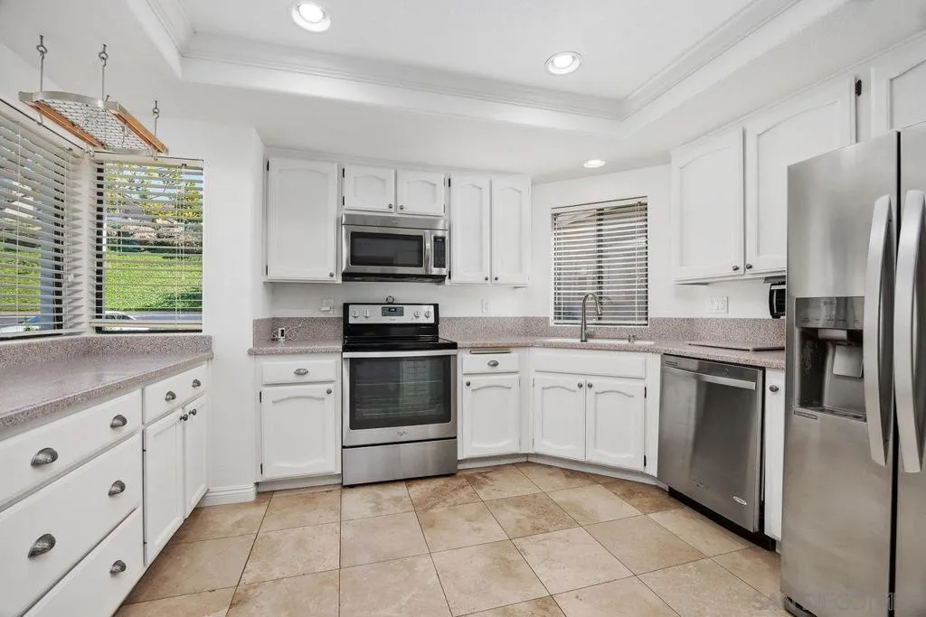 Welcome to the highly sought-after gated community of Masters Hill in Bernardo Heights. This beautifully updated end-unit home offers views of the 18th hole at The Heights private country club golf course. Featuring 2 bedrooms, 2 full bathrooms, and 1,280 square feet, this home also includes a finished bonus room with direct access from the garage, ideal for a home office, gym, or additional storage. The kitchen is a cook’s delight, complete with stainless steel appliances, Corian countertops, pantry, pot rack, recessed lighting, and travertine flooring. The spacious living room boasts vaulted ceilings, a cozy fireplace, new carpet, ceiling fan, and a double-pane sliding glass door that brings in natural light. The primary suite is generously sized with mirrored closet doors and a ceiling fan. The en-suite bathroom features granite countertops, dual sinks, and an updated shower. Additional highlights include a roomy two-car garage with ample storage, overhead racks, and a large loft storage area. Residents enjoy access to three community pools and spas, along with membership to the Bernardo Heights Community Center, all included in the HOA.
