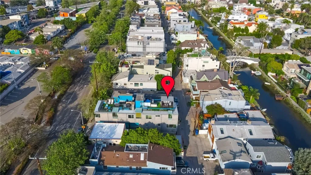 Architectural single-family home with a rooftop deck overlooking the Venice Canals. This south-facing residence with no common walls is set back from the street and filled with natural light, offering a sense of privacy in the heart of Venice. The main level features an open floor plan with two living areas, a gas fireplace, dining area, and a well-appointed kitchen with breakfast bar. The Venice Farmers Market is within walking distance. Upstairs includes two bedrooms, two bathrooms, a loft space ideal for an office or flexible use, and a dedicated laundry room. The primary suite features a walk-in closet and a bathroom with dual sinks, soaking tub, and separate shower. Additional features include high ceilings, a rooftop deck with canal and mountain views, built-in outdoor kitchen and BBQ, direct-access two-car garage, EV charging, and secured entry.