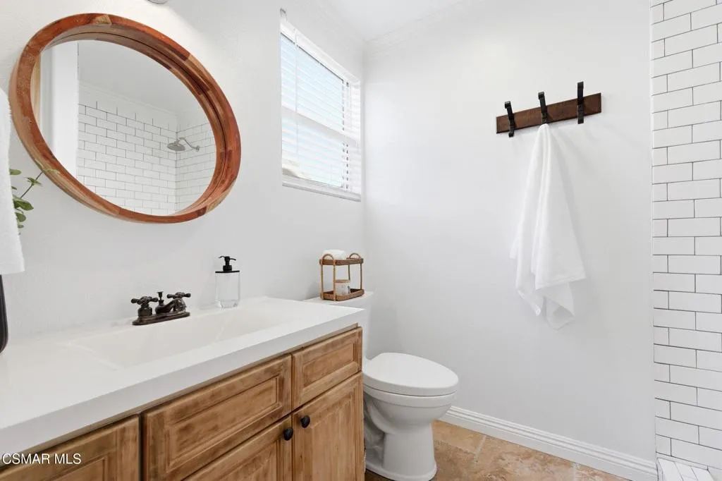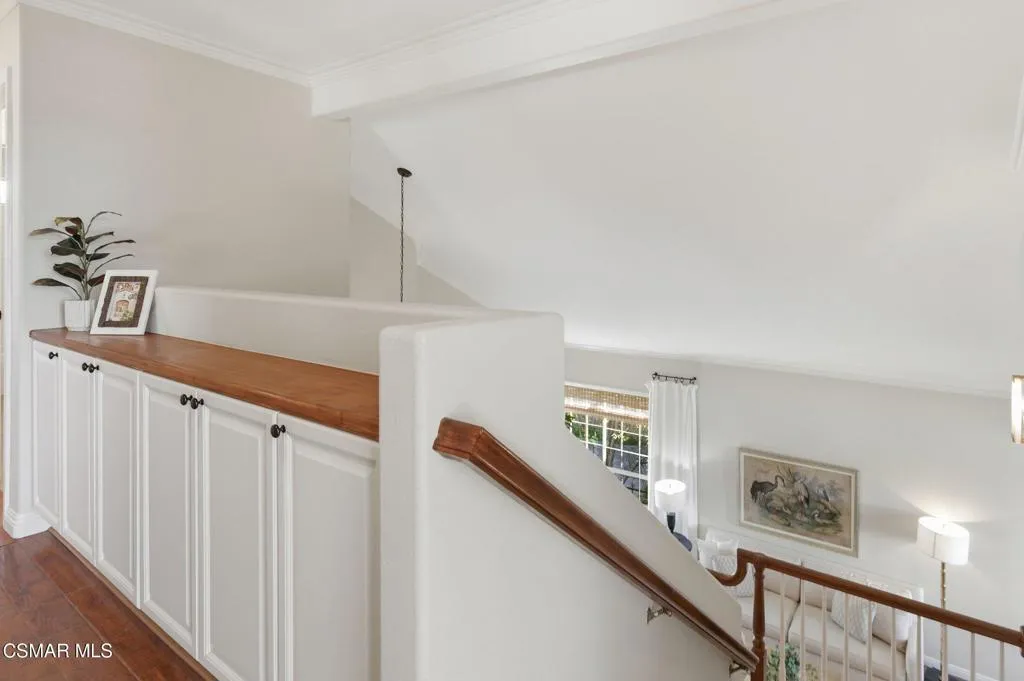 Nestled in the highly sought-after Mission Oaks neighborhood of Camarillo, this beautifully maintained two-story residence offers exceptional curb appeal and a warm, inviting presence from the moment you arrive. Thoughtfully designed, the home features a desirable floor plan with 4 bedrooms and 3.5 bathrooms, including a convenient downstairs bedroom with its own private bath--ideal for guests, multigenerational living, or a private home office. The entry opens to a large, light-filled living room that flows effortlessly into the dining area, creating an elegant space for gatherings and everyday living. The heart of the home is the spacious family room, complete with a cozy fireplace and seamless access to the kitchen. The kitchen itself is generously sized and well-appointed, offering stainless steel appliances, ample cabinetry, and plenty of counter space for cooking and entertaining. A downstairs laundry area and powder bathroom add to the home's functionality and comfort. This home also features distressed wood flooring, crown molding, and large baseboards that elevate the home style with a refined yet welcoming feel. Upstairs, the expansive primary suite serves as a peaceful retreat. The remodeled primary bathroom features modern finishes, dual vanities, and a huge walk-in closet designed for exceptional storage and organization. Two additional upstairs bedrooms include brand-new carpet, and all bathrooms throughout the home have been tastefully updated, ensuring a cohesive and contemporary aesthetic. The serene backyard oasis has meticulously landscaped grounds to create a sense of privacy and tranquility. A new covered patio and inviting sitting area provide the perfect setting for outdoor dining, relaxation, or simply enjoying the stunning views that make this property truly special. Whether hosting friends or savoring quiet moments, the outdoor space is designed to be enjoyed year-round. Located within close proximity to all three highly regarded local schools--Tierra Linda Elementary, Las Colinas Middle School, and Adolfo Camarillo High School--this home offers not only comfort and beauty but also convenience and community. With its thoughtful upgrades, versatile layout, and picturesque surroundings, this Mission Oaks gem is ready to welcome its next chapter.